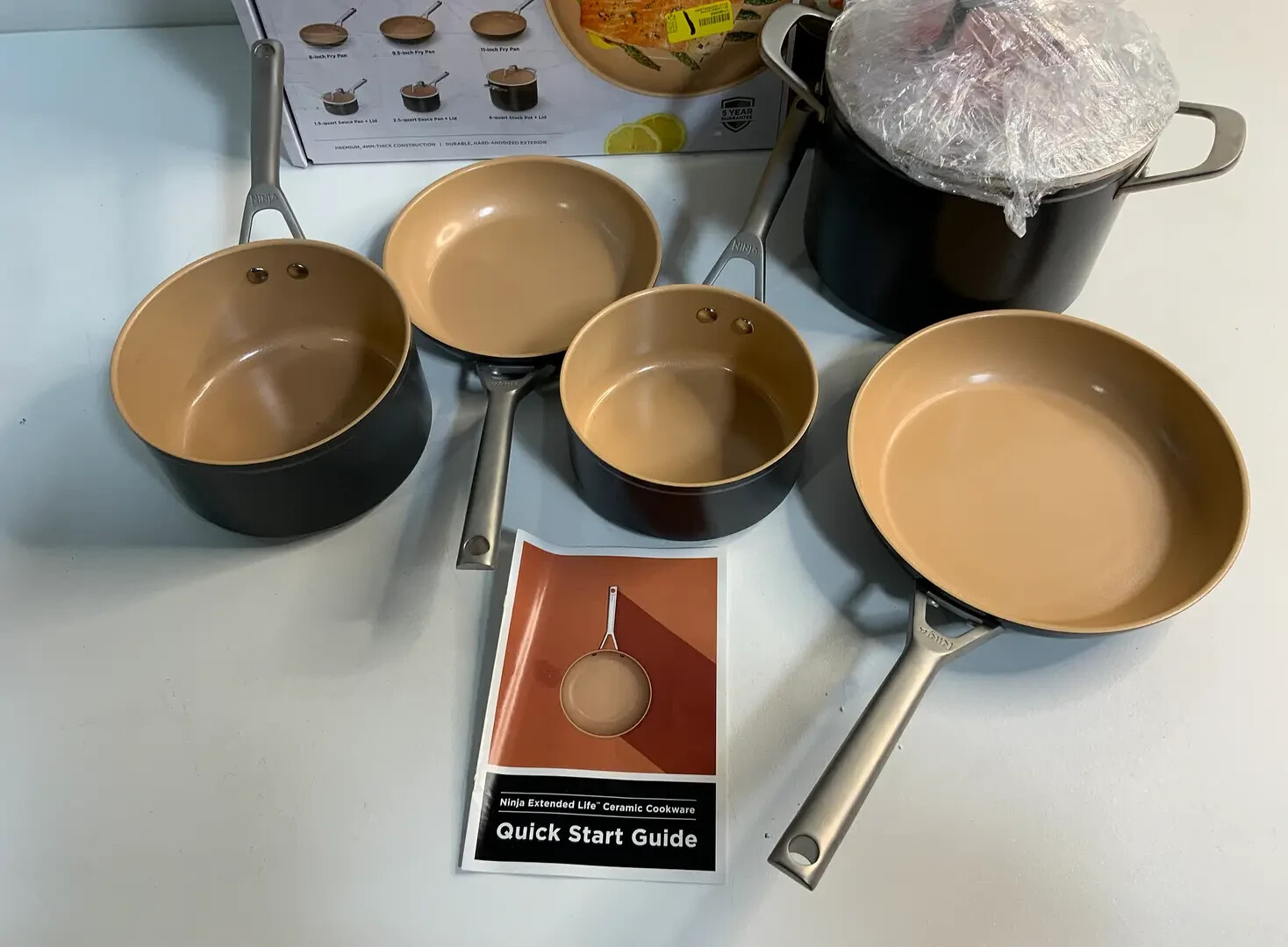 Ninja Extended Life Premium Ceramic 9-Piece Cookware Set CW99009 Brand: Ninja Model: CW99009 Color: Black, and tan Missing: 9.5-in pan, two quartz saucepan lids