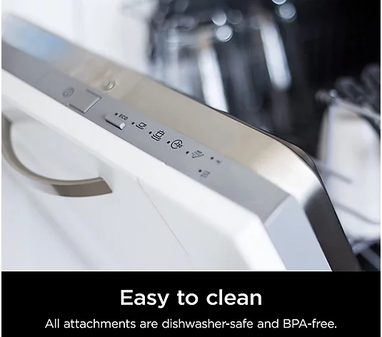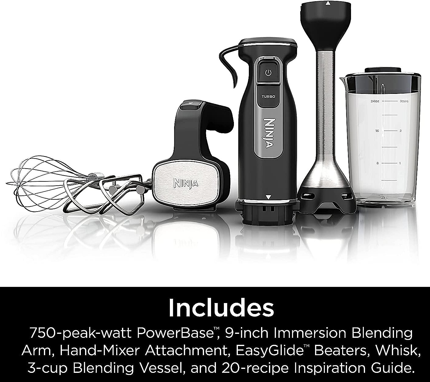 Everyone loves a multitasker, especially in the kitchen! Save counter space with this multi-function mixing system that transforms from a high-speed hand mixer into a powerful immersion blender with a simple change of the included attachments. From Ninja. Includes PowerBase with cord, 9" immersion blending arm with stainless steel blade and built-in pan guard, hand mixer attachment with whisk and EasyGlide beaters, 3-cup blending vessel with storage lid, and 20-recipe inspiration guide 750W Transforms to a high-speed hand mixer and powerful immersion blender with included attachments Five mixing and two blending speeds Pan guard allows you to blend directly in pots and pans without scratching them Dishwasher-safe attachments; hand wash other components Measures 2.75"D x 3.03"W x 15.94"H; Cord 5'L UL listed Imported