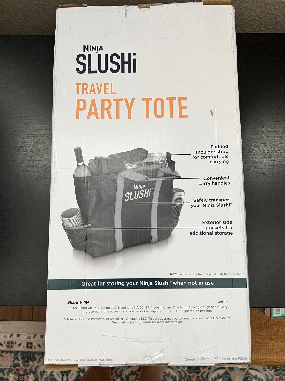Brand new in box, genuine Ninja SLUSHi Travel Party Tote Bag. This listing is for a factory sealed unit - the photos of the tote outside the box are from another unit I own and are keeping. Compatible with the Ninja SLUSHi machines, FS300 Series and FS299. Use this extra large tote bag and safely take your Ninja machine party hopping. Features a padded shoulder strap on the carry handles for comfortable carrying, and two exterior side pockets for additional storage. It's also great way to store your SLUSHi machine when not in use.