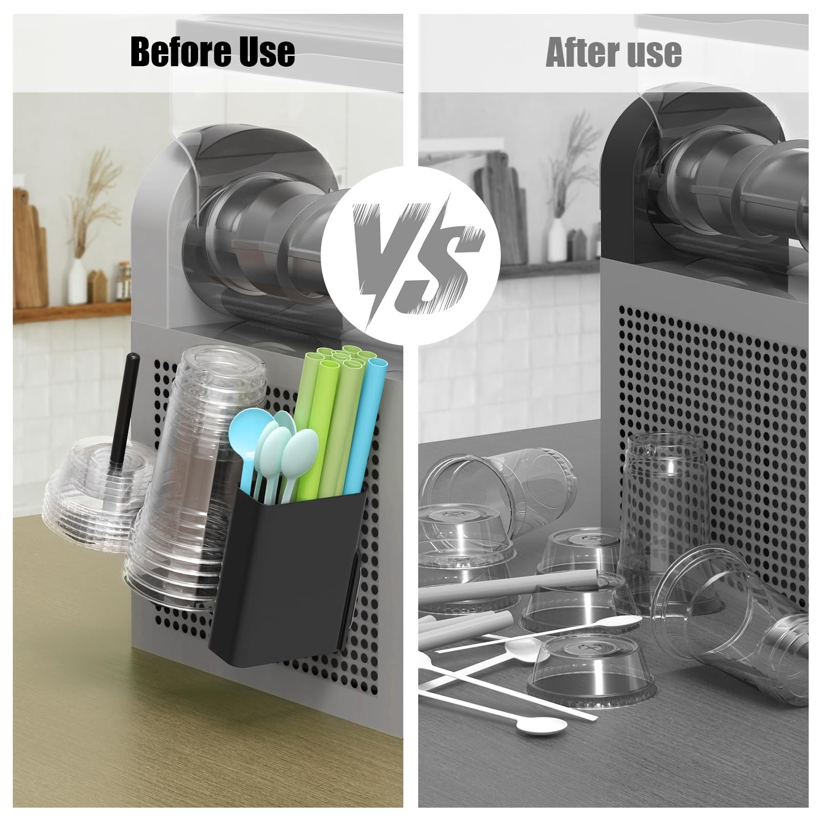 The upgraded cup holder features magnetic design,easy to removal and installation. Its waterproof material can be cleaned directly, making it ideal for use at family gatherings, outdoor stalls and other scenes. Magnetic Cup Holder : This upgraded cup holder organizer is compatible with various slushie machines,like Ninja Slushie Machine FS299/FS301/FS300.The magnetic cuporganizer features tool-free removal and installation, allowing for versatile use at home or outdoors. Heavy-Duty Load Performance : Strong magnetic suction holds up to 1kg/2.2lbs. Example weight capacities: 200 disposable cups (5g each), 350 lids (3g each), or 500 straws (2g each) separately. It can reliably handles daily weight demands, eliminating concerns about load capacity. NOTE: This quantity is for load-bearing demonstration only NOT actual use!!!! 3 Compartment Storage Holder: It comes with storage slots for straws, cups and lids attached directly to the side of the machine. Keep your drink supplies tidy and within easy reach whenever you make a smoothie. Premium And Durable Material : Made of high-quality ABS material, waterproof and rust-resistant, can be cleaned directly.The magnetic design allows it to be mounted horizontally or can be adjusted to a suitable angle as your preference. Easy to Use : Package contains all in one cup organize holder and magnets. Step 1-remove blue films from both magnets and attach them to the cup holder(Note: Ensure the blue-backed side connects to the cup holder). Step 2-Peel off white films from the magnets and stick them to your Ninja Slushie Machine's side. Installation takes less than a minute.