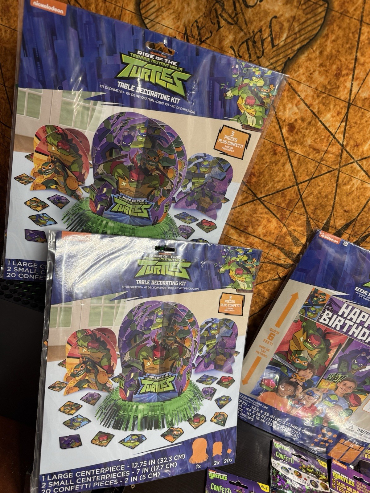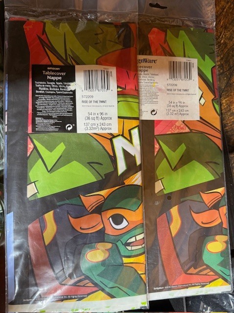 **JUST ADDED** 2 LARGE TABLE COVERS "RISE OF THE TMNT" each 54'x96". Also, in this bundle you’ll receive 2 table decorating kits that have 23 pieces each, 1 package of six 12” balloons, 2 bags of confetti, 2 packages of 16 treat bags in each and 1 package of scene setters with 12 photo props. Fast free shipping USPS ground advantage or UPS.