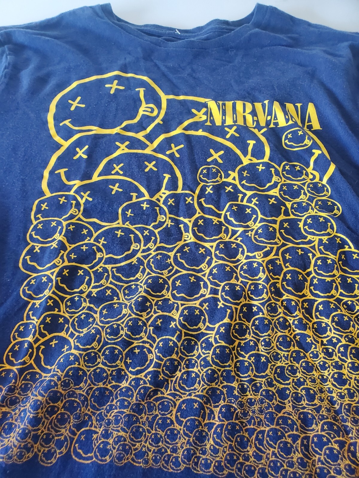 The Nirvana Tee Shirt in size small is a classic men's t-shirt with short sleeves and a comfortable regular fit. It features a stylish blue color that is perfect for casual wear. Made from high-quality material, this tee shirt is a versatile addition to any wardrobe, suitable for everyday wear or for showing off your love for the band Nirvana.