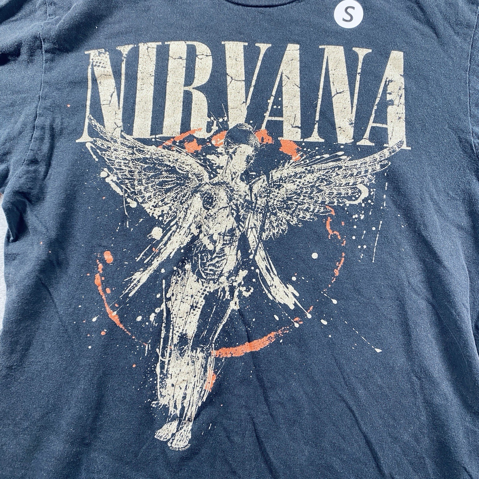Nirvana In Utero Angel Graphic Tee SZ Small Black Rock Band Shirt Grunge - HOLE* The Nirvana In Utero Angel Graphic Tee in size small is a black rock band shirt featuring a graphic print of an angel. This short sleeve T-shirt has a crew neckline and is machine washable for easy care. It has a regular fit and is made for men, with a chest circumference of 34 inches. The shirt has a small hole in the back near the bottom, which is highlighted in the pictures. This grunge-inspired tee is perfect for fans of alternative rock and punk music, paying homage to the iconic rock band Nirvana. See photos for the actual item available. Feel free to contact us with any questions. Shop our store with confidence as we offer 30-day returns on all purchases. Additionally, you can save money by making multiple purchases to take advantage of our discount shipping policy. You will pay the highest shipping cost for a single item in your cart and $3 for each additional item. Blue Blossoms Boutique will consider all reasonable offers so if you are interested in any of our items don't hesitate to make an offer if you feel our price is a little higher than you are willing to pay. The worst we can do is say no and perhaps we will accept or offer you a different price.