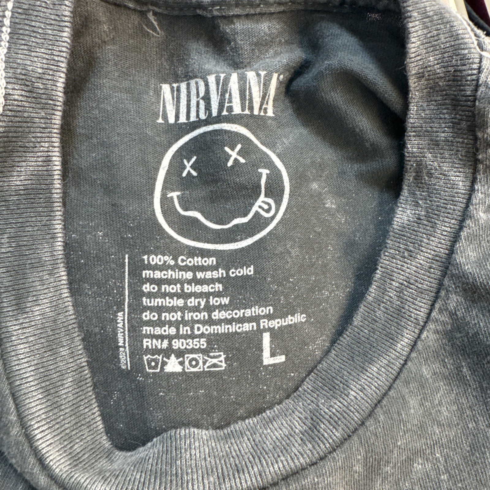The product is a new Nirvana in Utero graphic short sleeve t-shirt in black, men's size large. Made of cotton, this crew neck shirt features a logo accent and is machine washable. With a regular fit and all-season features, it is designed for easy care and breathability, perfect for summer, fall, and spring. The shirt reflects themes of music, 90s culture, and hip hop, making it a stylish choice for fans of Nirvana and the iconic album.