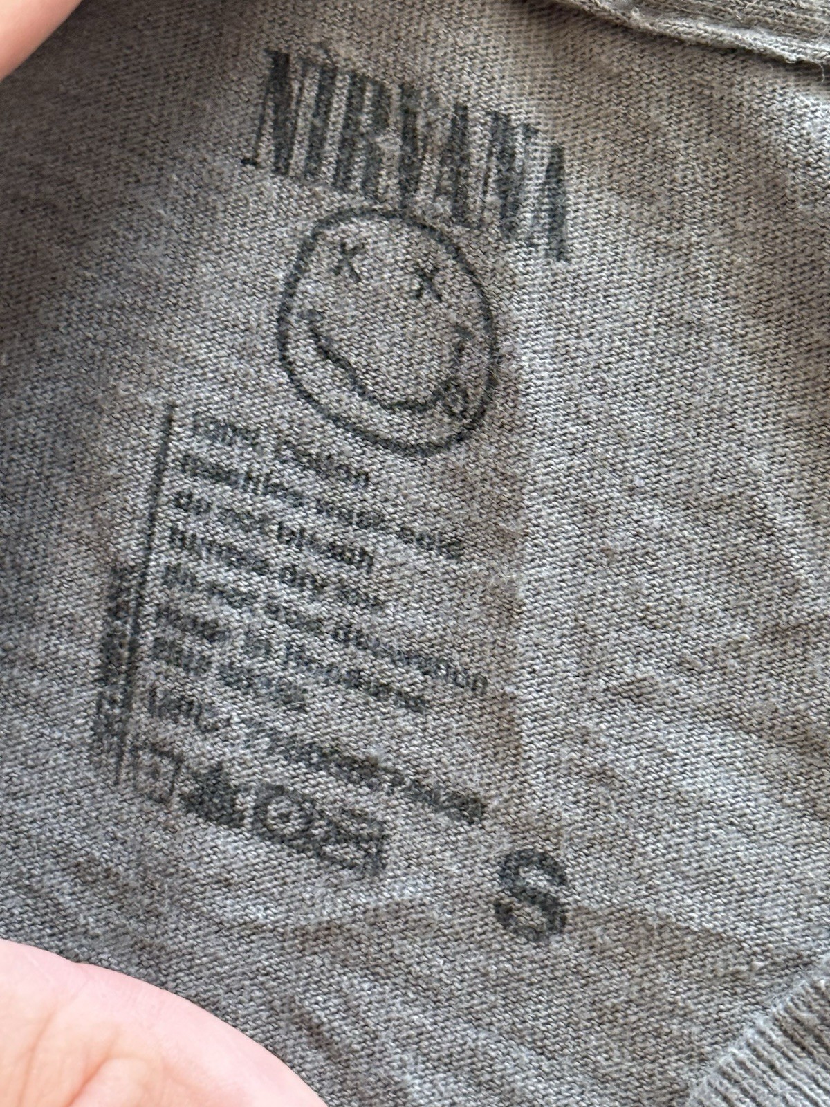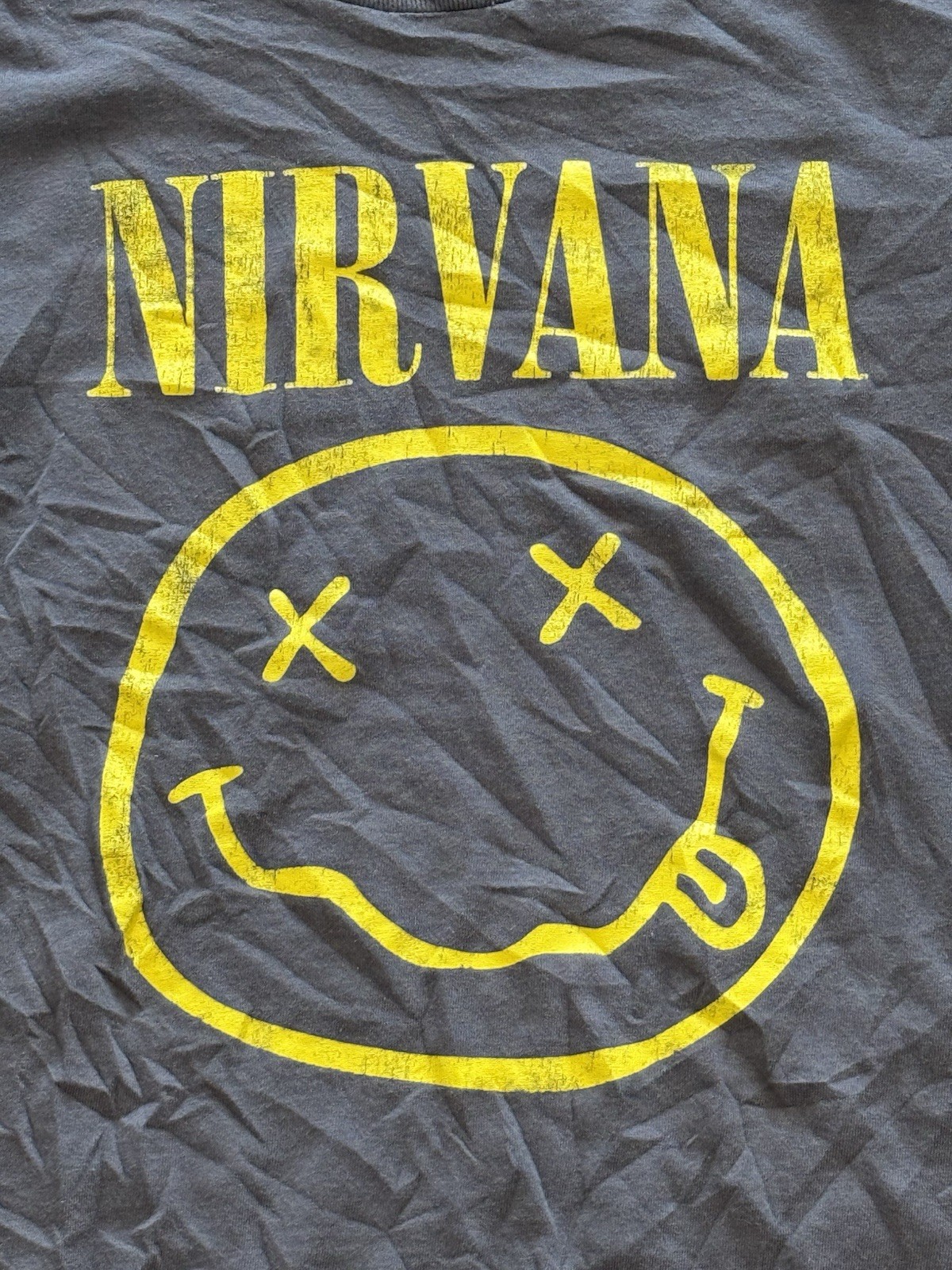 The Nirvana Mens Size Small T-Shirt features a classic solid gray design with a smiling Nirvana logo on the front, perfect for fans of the iconic rock band. Made of breathable cotton knit fabric, this regular fit tee has a crew neck and short sleeves, making it suitable for all seasons. Machine washable and easy to care for, this Nirvana t-shirt is a stylish addition to any music lover's wardrobe, representing the band's enduring legacy in the world of music.