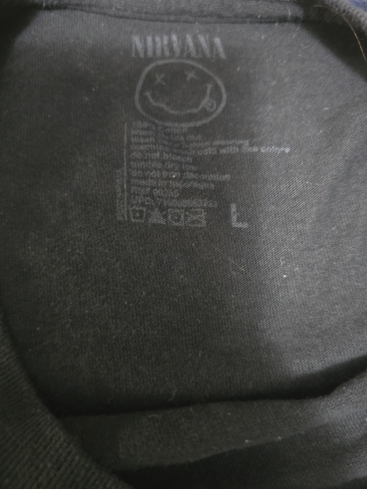 This Nirvana shirt in size Large is a classic and timeless piece for men's clothing. Made of comfortable cotton material, this black shirt features a crew neck and short sleeves, perfect for the summer and spring seasons. The shirt showcases the iconic Kurt logo, adding a touch of rock 'n' roll style to your wardrobe. With a regular fit and easy-care instructions (machine washable), this Nirvana shirt is a must-have for any fan of the legendary band. sold as is some wear
