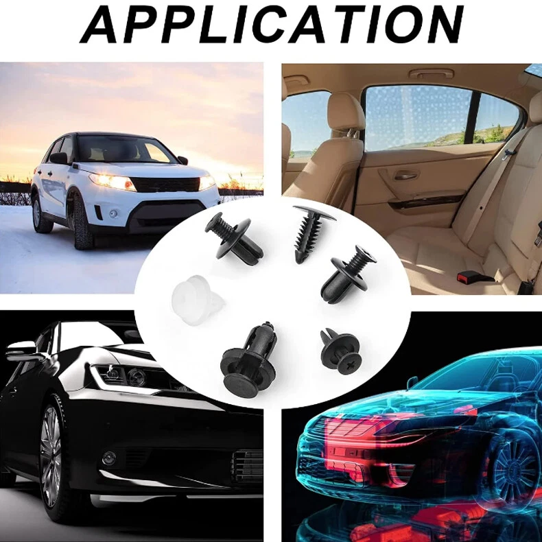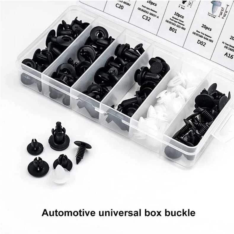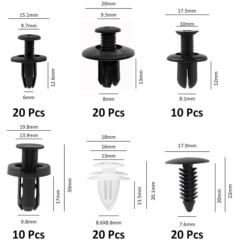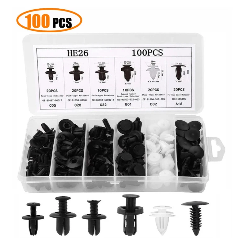 Features: Various fasteners to meet the needs of different parts of the car. Used widely for car fender, bumper, door or other car surface. High quality plastic material, durable and long service life. 6 different Push pin rivet for many brand vehicles. Great material - t hese bumper clips are made of high-quality Black nylon Material, anti-wear and anti-corrosion, would not break or crack easily during use. Widely application - these Push clips are widely used for trim panel clips, door trim clips, door Panel clips, bumper clips, fender clips, engine cover and splash shield retainers replacement. It always covers some applications include telecom equipment, motor vehicles, domestic appliances, furniture and electrical equipment. Box Compartment Includes Detailed Images Of Size And Quantity For Each Retainer To Help Stay Organized. Note: All vehicles have a range of different clips used on them. Different models have different sizes and there are no universal clips. Please check as much as possible before buying. Package including 100pcs Clips,1 Plastic Box,5 removal tools Clip of C05 Screw Type Clip Retainer Rivet Condition: Brand New Material: Black Nylon Size Approx: Head Diameter: 15mm Stem Length: 12mm Fits Into 6mm Hole For GM Replace 20426301 For Mazda Replace 9926-50-625 For Toyota Replace 90467-06017 For Toyota Replace 90467-06017-20 For Toyota Replace 90467-06017-41 For Auveco A14260 Clip of C20 Fender Liner Clip Splash Shield Blind Rivet Fits For Mazda Replace FB01-56-964 Fits For Honda Replace 90675-SB3-003 Fits For Nissan Replace 63876-95596 Fits For B16 B18 B18C B20 H22A EK9 EG6 Fits For Accord Civic Prelude CR-V Del Sol CRX Fits For INTEGRA GSR S2000 AP1 MUGEN Fits For TYPE R Si Condition: Brand New Material: Black Nylon Size Approx: Head Diameter: 20.6mm (0.81") Stem Length: 9.5mm (0.37") Fits Into 8mm (0.32") Hole For Auveco A16000 Clip of C32 Push-Type Retainer Black Nylon Head Diameter: 20mm Stem Length: 13mm Fits Into 8mm Hole Fits For Mazda 6 2002-2006 Fits For Mazda 323 1998-2003 Fits For Ford Aspire Fits For Mazda Replace B092-51-833 Fits For Ford Replace MB-455-56143 Fits For Kia Replace MB455-56-143 Fits For Nissan Replace 09409-09302 Fits For Hyundai Replace 86590-28000 For Auveco A17632 Clip of B01 Front & Rear Bumper Retainer Push Type Clip Condition: Brand New Material: Black Nylon Head Diameter: 20mm Stem Length: 18mm Fits Hole Size: 10mm For Honda Replace 91503-SZ5-003 (1996-On) For Acura Replace 91503-SZ5-003 For Auveco A20564 For PAS9282, PAS938 Clip of D02 Interior Trim Board Retainer Clip White Nylon Top Head Diameter: 13mm Middle Head Diameter: 16mm Bottom Head Diameter: 18mm Stem Length: 15mm Stem Diameter: 8.5mm x 8.5mm Overall Length: 20mm Fits For GM Replaces 94858299 Fits For Geo Prizm 1998-On Fits For Pontiac Vibe 1998-On Fits For Toyota Replaces 90467-10161 Fits For Sienna, Solara & Tercel 1990-On Fits For Previa 2007-On, Corolla 2003-On Fits For Lexus LS460, LS460L 1990-On For Auveco A18876 Clip of A16 Radiator Yoke, Fender & Bumper Shield Retainer Christmas Tree Type Clip Black Nylon Head Diameter: 17.8mm Stem Length: 20mm Stem Diameter: 7.6mm For GM Replaces 1595864, 1605396 For Ford Replaces 388577S For Ford Replaces W705589-S300 For Chrysler Replaces 6030441 For Auveco A11146, A15414