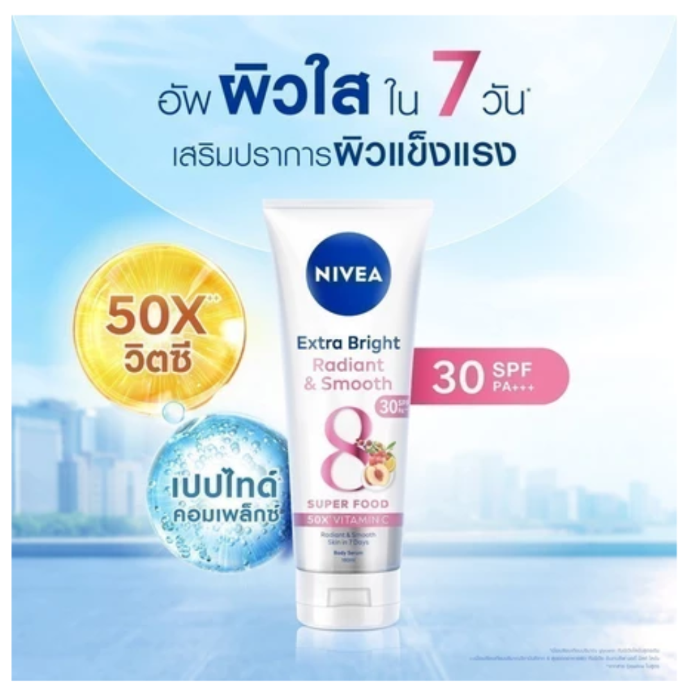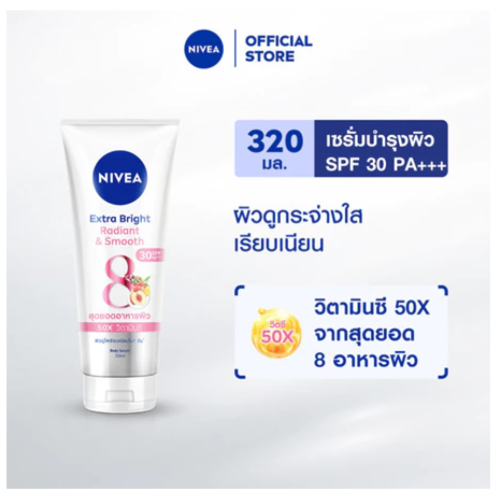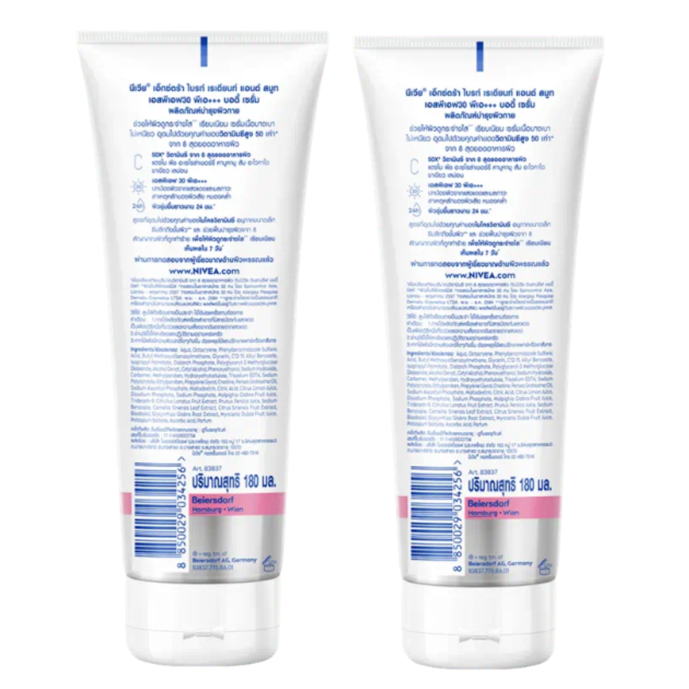 Nivea Extra Bright Radiant and Smooth SPF30 PA+++ 180 ml.x2 tubes Nivea Extra Bright Radiant and Smooth SPF30 PA+++ Body Serum Nivea Extra Bright Radiant and Smooth SPF30 PA+++ Body Serum Boost smooth, bouncy skin Concentrated serum, light texture, not sticky. Helps restore and nourish the skin deep into the skin cells. Make the skin look white and radiant with 3 times the power and boost smooth, soft, bouncy skin with 50 times the power of collagen booster, nourishing the skin all day long and protecting it from the sun. - Body care serum Boost smooth, bouncy skin Make your skin smooth and look white and clear^ not sensitive to the sun. - Concentrated serum, light texture, not sticky. Helps restore and nourish the skin deep into the skin cells+ - White and bright^ with the power of 3** and a boost to smooth, bouncy skin. With 50 times the power of collagen booster* - Nourishes the skin all day long while protecting it from the sun with SPF30 PA+++ - Passed the test from skin experts. ^Look white and bright naturally. (Cosmetics cannot change skin color. The results depend on the skin condition of each person) +Eddermis skin layer **Licoris extract Acerola Cherry and Vitamin C The product received may be subject to changes in package and quantity from the manufacturer. We reserve the right to make such changes. without prior notice Shipping Policy: - All our items are shipped from Thailand. We will send all items of receiving confirmed payment - Shipping Handling Worldwide. The package will be shipped directly from Thailand by Economy Shipping and it will take about 11-23 business days. Please be aware that some orders may be delayed at customs or bad weather condition, and this is out of my control. Thanks for your visiting. You will happy for our items. If you have any problem, please contact me before leave me negative feedback. CONTACT US Please contact us by ebay message only. We will get back to you within 24 hours.