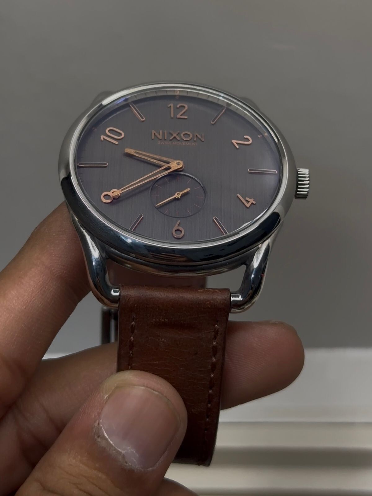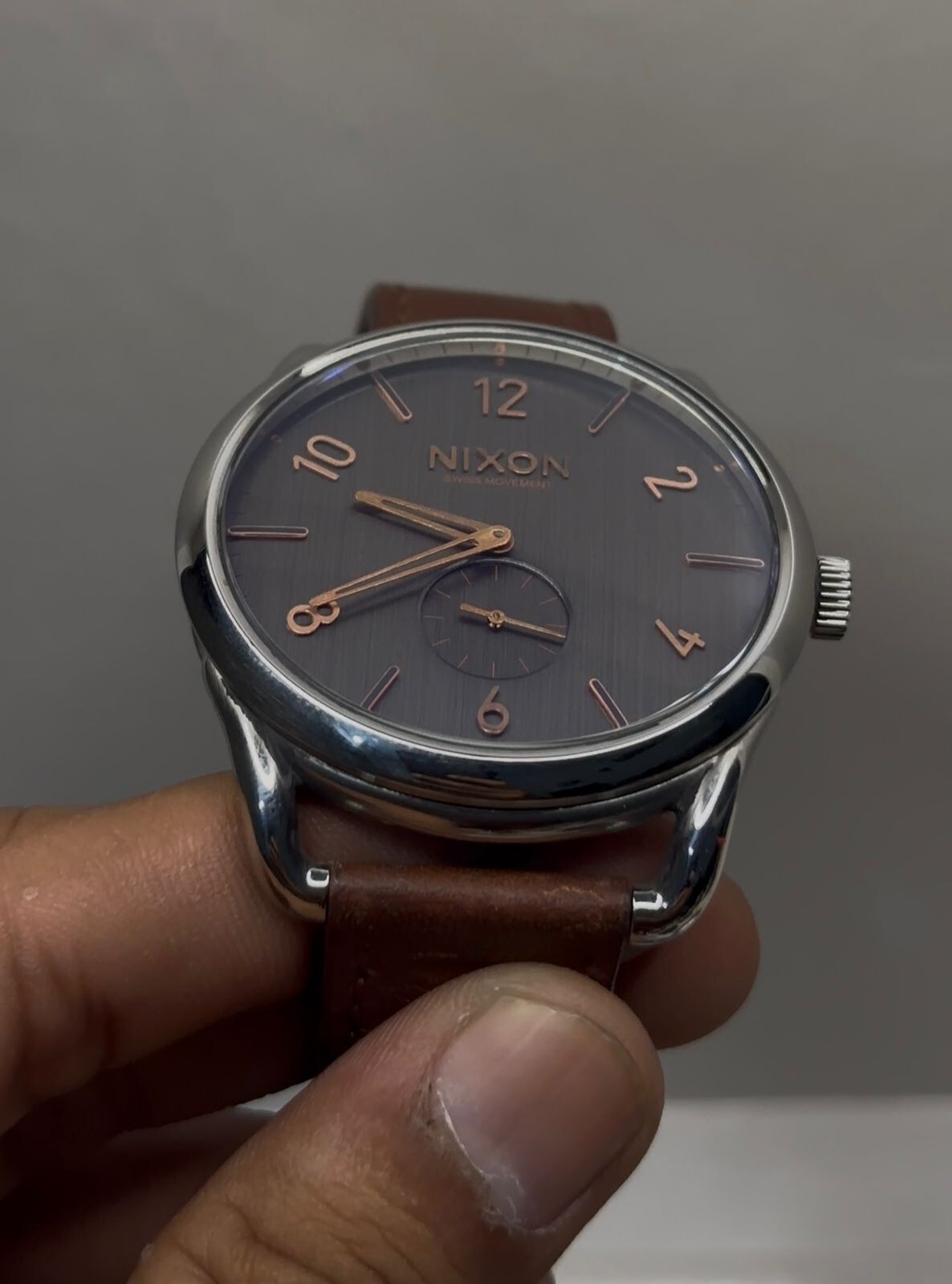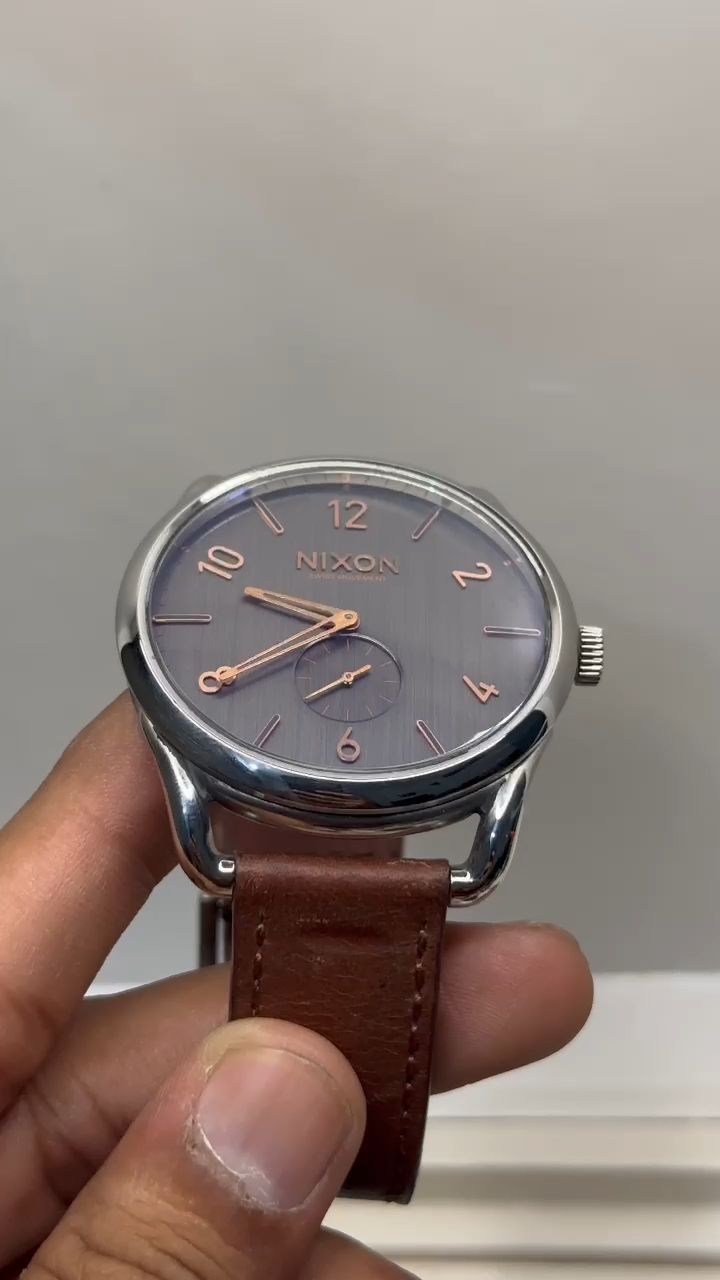 Crafted for the modern man with an affinity for classic style, the Nixon refreshing C45 wristwatch combines functionality with elegance. Its 45 mm stainless steel case houses a reliable Swiss quartz movement, ensuring precise timekeeping. The watch features a striking blue and gray dial, complemented by a durable stainless steel and leather band, both in a sleek silver tone. Designed to complement a variety of looks, from casual to formal, this timepiece offers a versatile accessory for any occasion. The Nixon refreshing is also equipped with a 100 m water resistance, making it suitable for everyday wear and light aquatic activities. A testament to its luxurious appeal, this watch is proudly made in Switzerland, showcasing quality craftsmanship in every detail.
