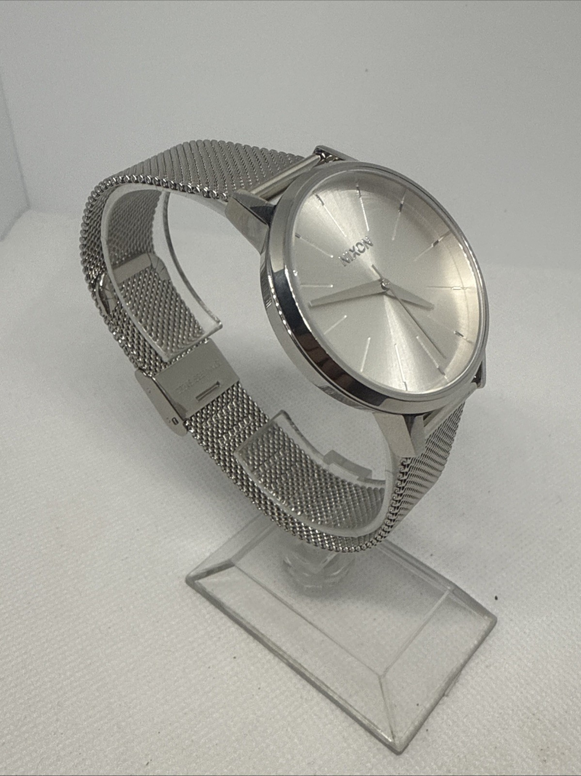 Elevate your style with this elegant Nixon Kensington women's wristwatch. Crafted with high-quality stainless steel, this watch boasts a sleek silver bezel and a fixed silver dial with stick indexes for easy reading. The fold-over clasp ensures a secure fit while the quartz movement provides accurate timekeeping. Water-resistant up to 50m, this watch is suitable for everyday wear and light swimming. The round silver case measures 37mm in diameter and is paired with a stainless steel band that complements the overall design. This Nixon Kensington watch is the perfect accessory for any dressy occasion and is sure to become a staple in your wardrobe.