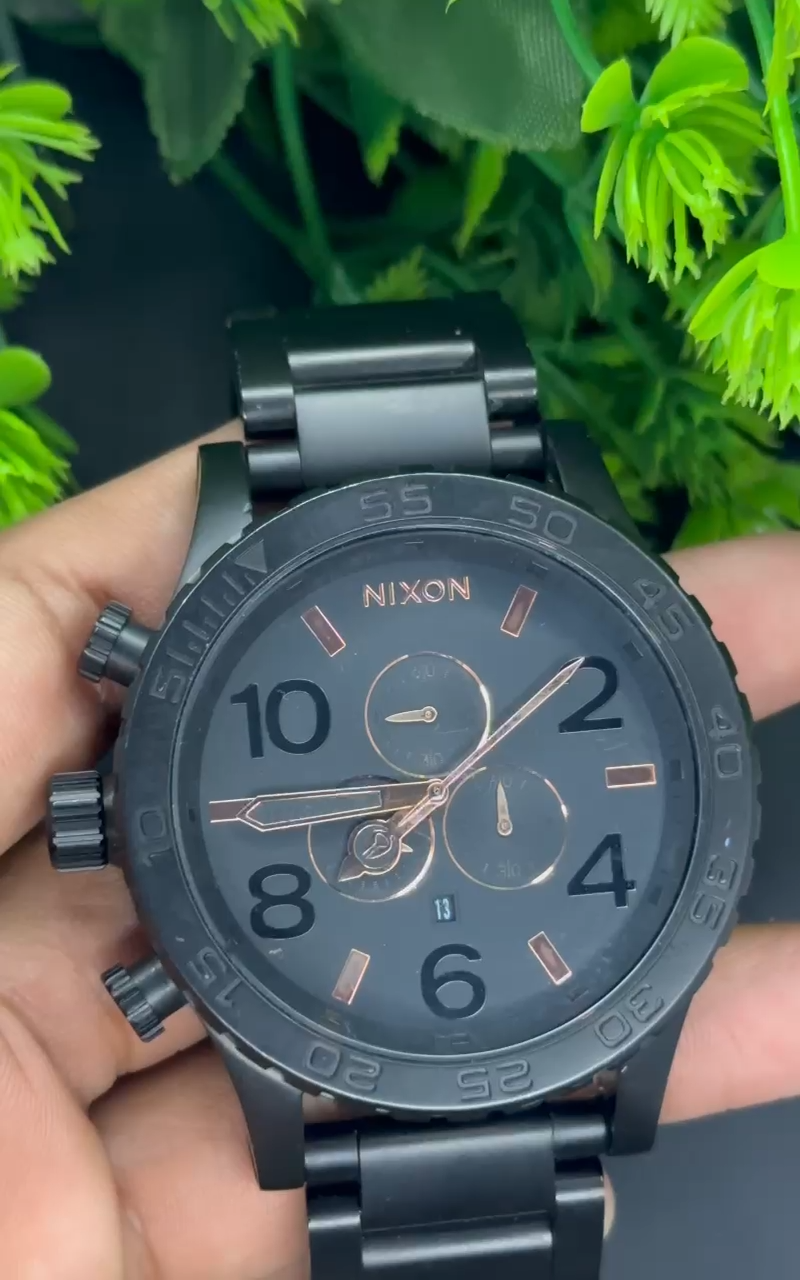 The Nixon Simplify the 51-30 Chrono is a stylish and versatile wristwatch designed for men. Featuring a sleek black stainless steel band and case with a black bezel and rose gold dial, this watch is perfect for casual, classic, or formal occasions. With a quartz movement and water resistance up to 30 meters, it also boasts useful features such as a chronograph, date indicator, and 12-hour dial. Made in Japan with high-quality materials, this Nixon watch combines durability with a modern design, making it a standout accessory for any watch enthusiast.