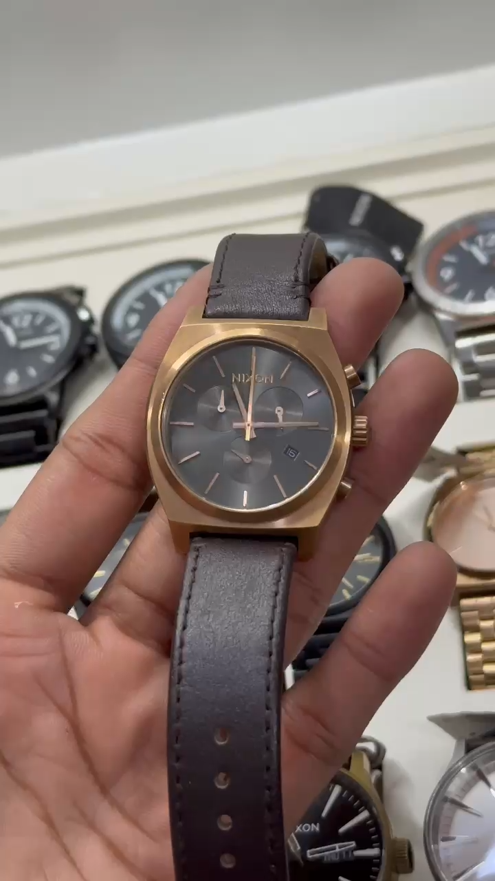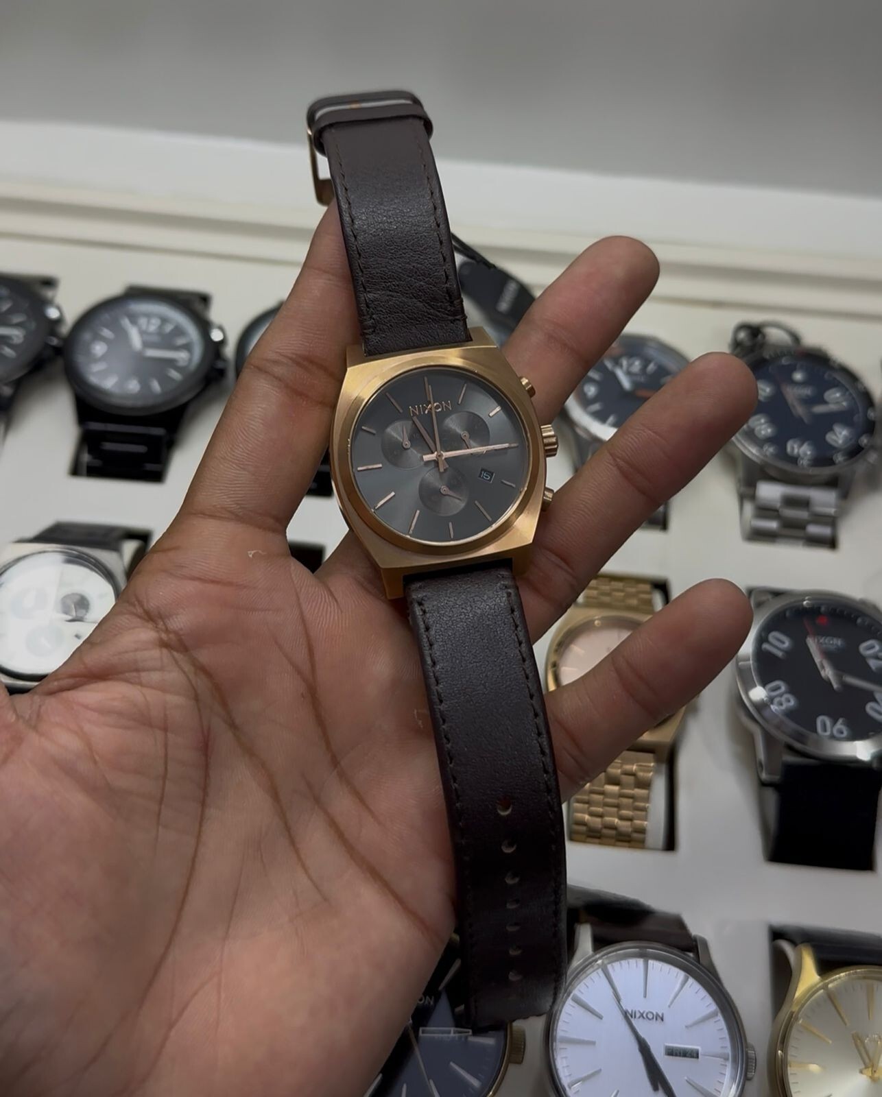 Elevate your style with the Nixon Synchronicity Time Teller Chrono, a sleek timepiece designed for those with a penchant for both form and function. Featuring a sophisticated gray dial complemented by brown stick indexes, this watch is a testament to classic elegance. The mineral crystal ensures durability while the 40mm stainless steel case provides a comfortable fit for unisex adults. Crafted for versatility, the Nixon Time Teller boasts a quartz movement and a range of features including a 12-hour dial, date indicator, and chronograph function. Leather and stainless steel band options cater to personal preference, with both materials promising durability and style. The watch is water-resistant up to 100 meters, making it suitable for diving and other water activities.