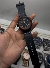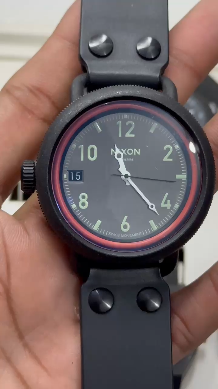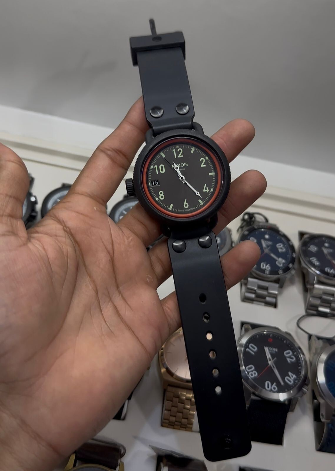 Elevate your timepiece collection with the Nixon Battle Stations! The October 300M Swiss Movement 13F1 wristwatch combines functionality and style, catering to a range of tastes from casual to formal. Its striking design features a bold black stainless steel case with a matching band, complemented by a striking red and black dial. Crafted for durability and precision, this watch boasts a quartz movement and is Swiss-made, ensuring top-notch performance. It's designed to resist water up to 300 meters, making it a suitable companion for both professional marine activity and serious scuba diving. Additional features like a date indicator and a 12-hour dial enhance its practicality, while its analog display offers easy reading of time.