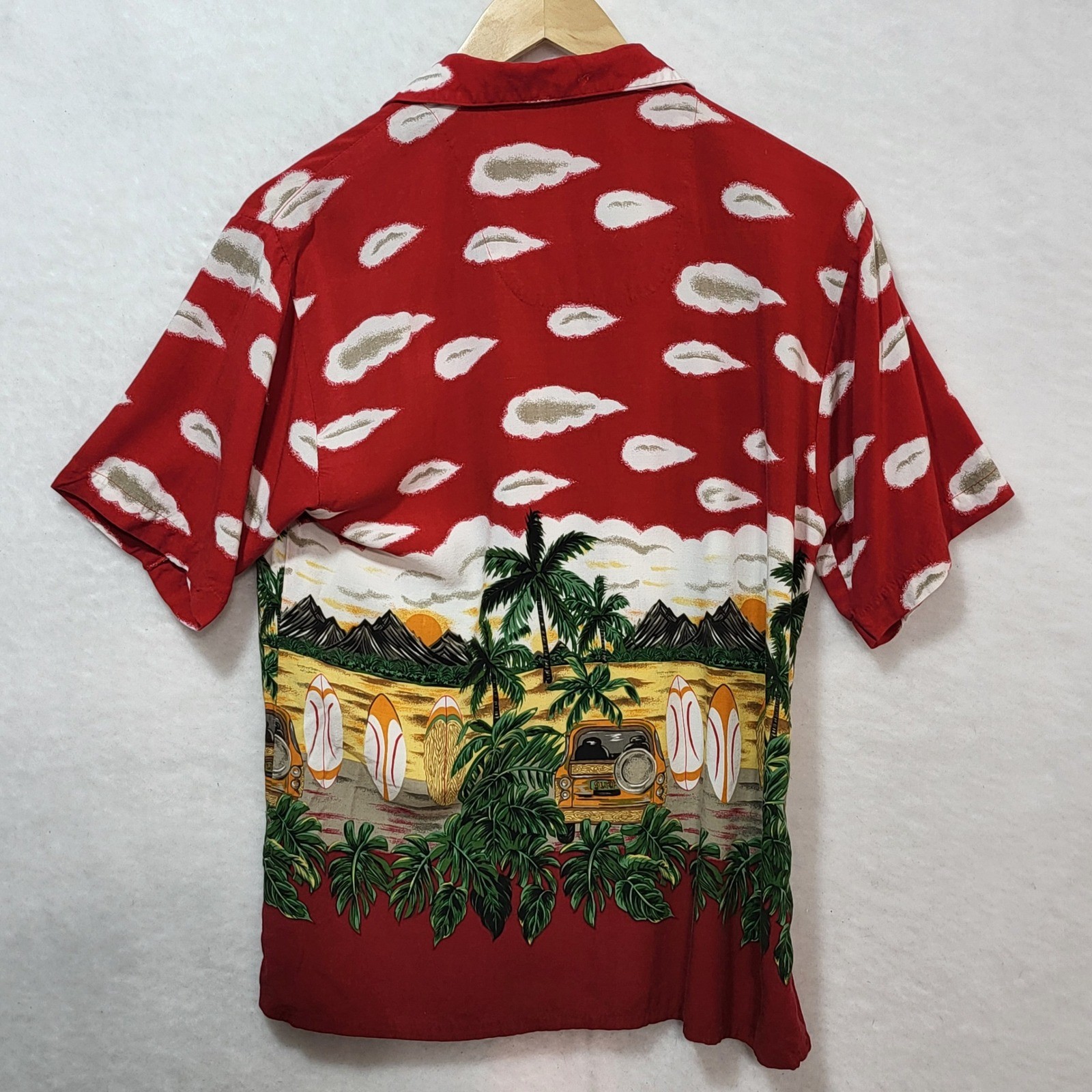 Classic short sleeve button-down shirt features a vibrant tropical beach scene with surfboards, palm trees, and vintage woodie wagons. Crafted from lightweight rayon, this camp collar top offers a relaxed fit perfect for summer vacations or casual wear. The bold red upper is accented by a whimsical cloud print that transitions into a detailed landscape graphic along the hem. Brand: No Boundaries Material: 100% Rayon Style: Hawaiian Camp Shirt Pattern: Tropical Surf Scene Color: Red, Yellow, Green Neckline: Collared Sleeve Length: Short Sleeve Closure: Button Front Hem: Straight Origin: Made in Korea Keywords: Aloha, Surf, Beach, Tropical, Vacation, Retro, Woodie, Palm Tree, Summer, Rayon, Kitsch, Coastal, Kidcore, Boys Fashion • We ship within one business day. • Please compare the measurements to something you already own. Thank you for supporting our small business!