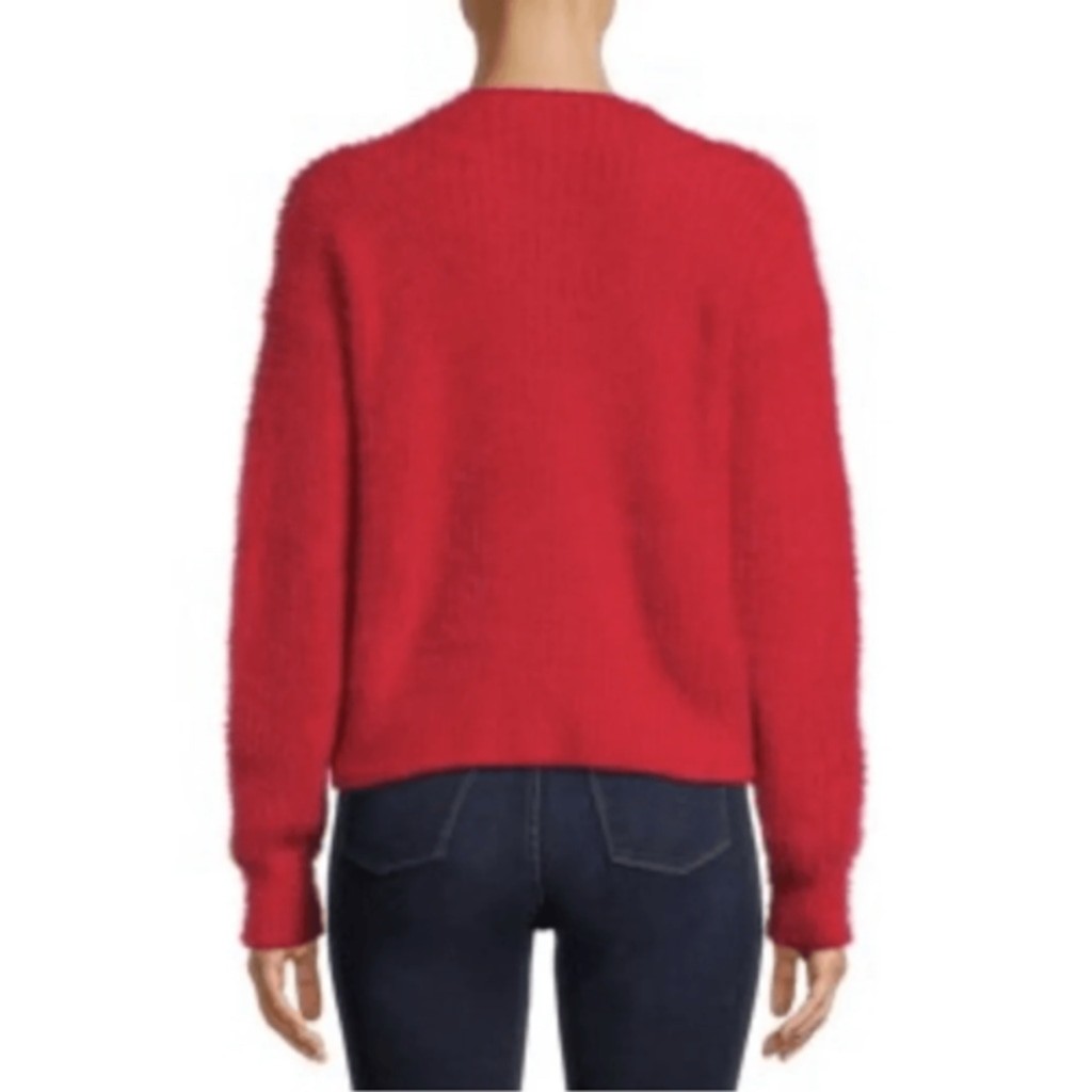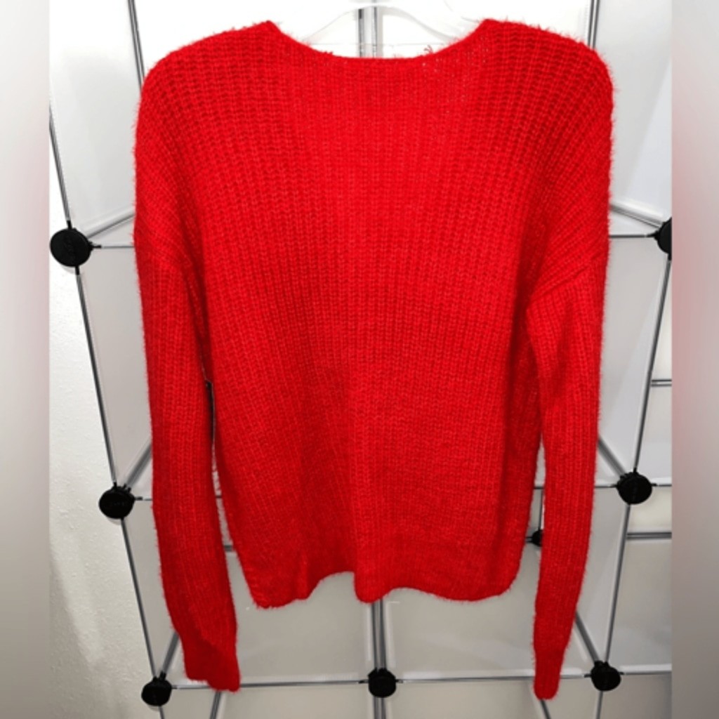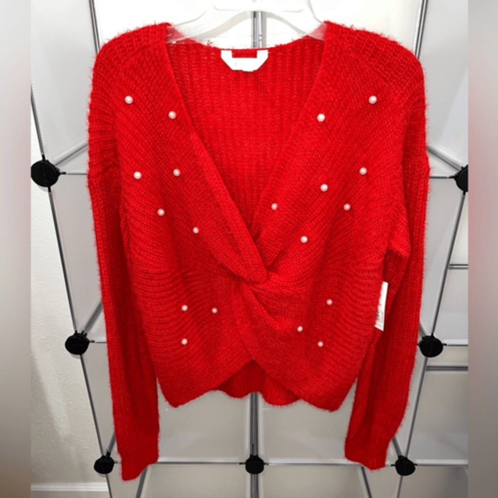 No Boundaries Juniors' Red Twist Faux Pearl Sweater Size XL New with tags. (Size L Regular In Women) Stand out in style with this unique and fashion-forward No Boundaries Pullover Sweater. With front twist detail and all-over delicate faux pearl embellishment, this long-sleeved sweater will be your new favorite. Material: 50% Acrylic/50% Nylon Care: Machine washable Country of Origin: Imported