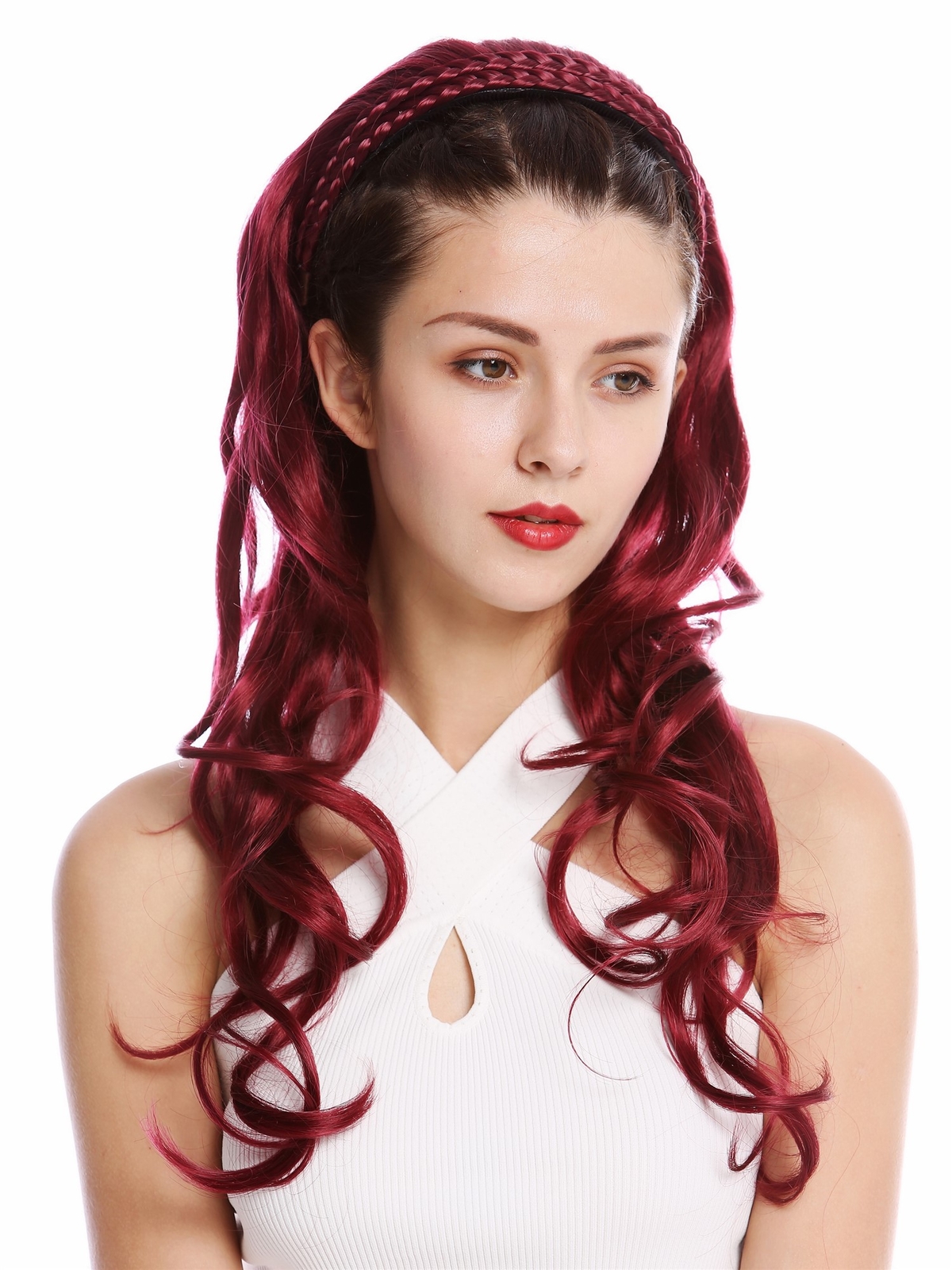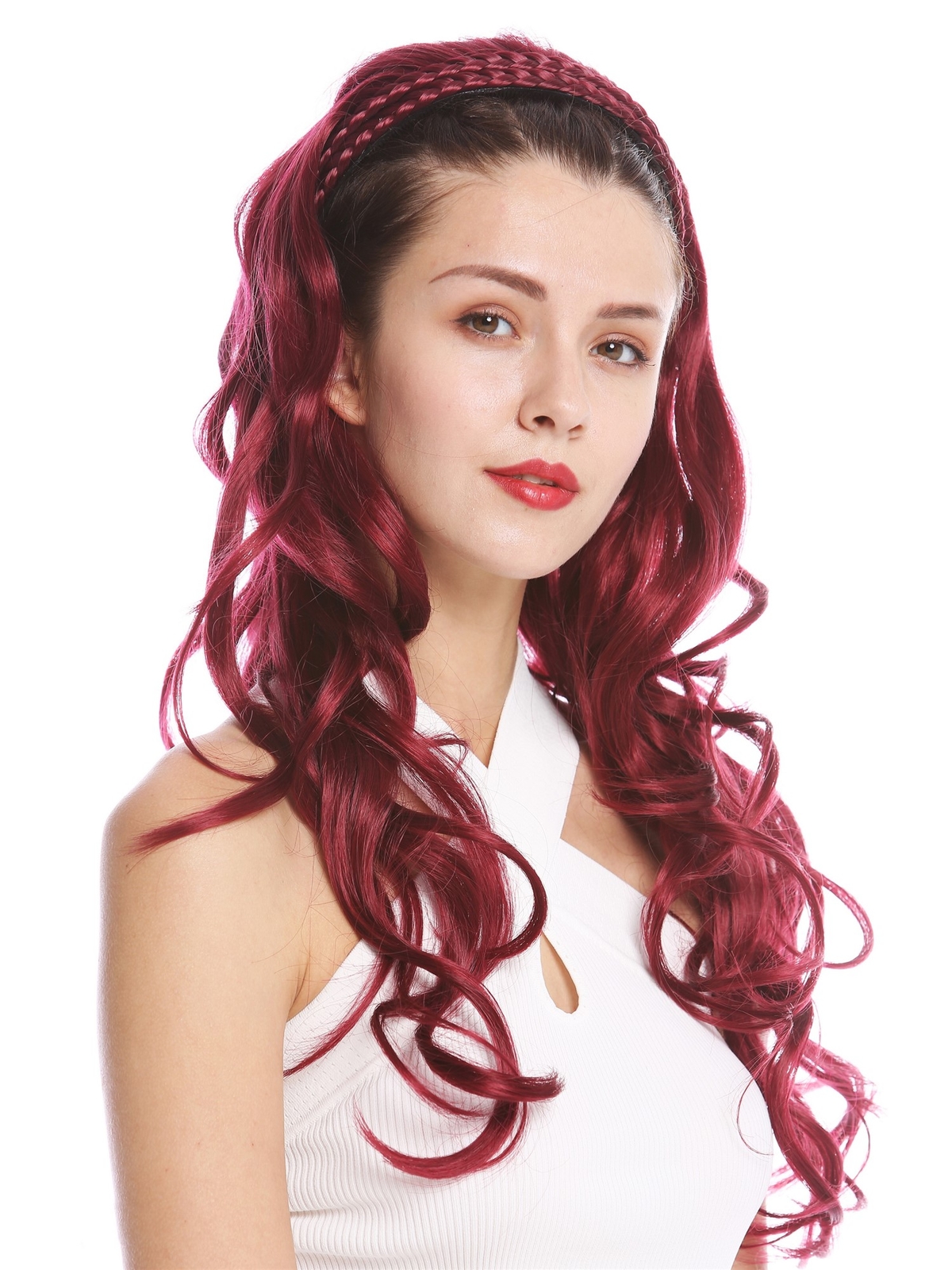Half Wig Hair Piece Noble Braided Headband Very Long Wavy Red Garnet Red The description of this item has been automatically translated. If you have any questions, please feel free to contact us. Welcome to the VK Event Fashion Ebay shop. We exclusively sell wigs and hairpieces from the WIG ME UP ® brand - products made from synthetic hair and also real hair, from clip-in extensions to wigs for carnival and Halloween to high-quality wigs for everyday life. We also exclusively distribute products from the DRESS ME UP brand - costumes, hats, stockings and all imaginable accessories for your fancy dress for carnival and Halloween. Item description Elegantly styled half wig with very long, beautifully wavy hair in garnet red - the hairpiece is held in place by a headband decorated with braided hair. New with tags Model: DW1025 Color code: 39 Length: approx. 100% polyester Item number: DW1025-39(D459) With this elaborately crafted, very voluminous half wig made of high-quality synthetic fiber, you can wonderfully conjure up significantly more length and fullness in your own hair. The elegantly braided headband holds the hairpiece firmly on the head - and additional combs ensure even better fixation. The hairpiece is of course new and comes with a label - on the label you will also find care instructions in German, English, Spanish and Italian. The item will be shipped discreetly in neutral packaging. More eBay shop categories Elegantly styled half wig with very long, beautifully wavy hair in garnet red - the hairpiece is held in place by a headband decorated with braided hair. Marke WIG ME UP Stil Geflochten Haarstruktur Gewellt Länge 65 cm Farbton Rot EAN 4260517735093 Haartyp Alle Haartypen Geschlecht Damen Altersempfehlung Erwachsener Haarfarbton Rot Abteilung Erwachsener Thema Natürlich Herstellernummer DW1025-39(D459) Gefertigt aus Kunsthaar Produktart Haarteile/Toupee Kappengröße Einheitsgröße