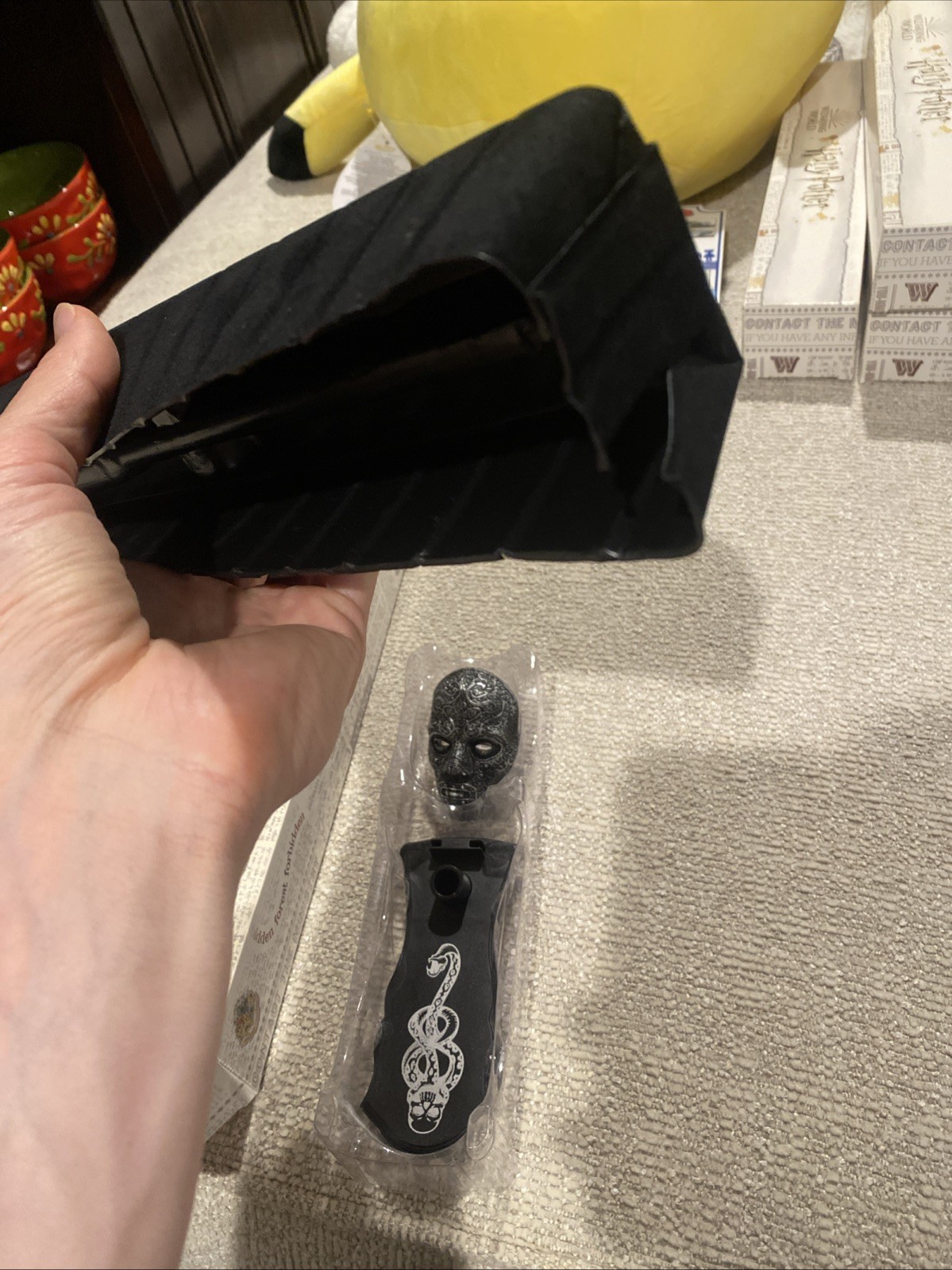 New open box The plastic casing broke that holds the wand. The product is a collectible Harry Potter wand made by Noble Collection. It is designed to depict various characters from the Harry Potter franchise, including Death Eaters and the Patronus. The wand is made of plastic and measures 12 inches in length. It comes with a collectible Dark Wizard Display Stand and a small Death Eater mask. The product is packaged originally and has been opened. It is a great item for all occasions and perfect for fans of the Harry Potter series.