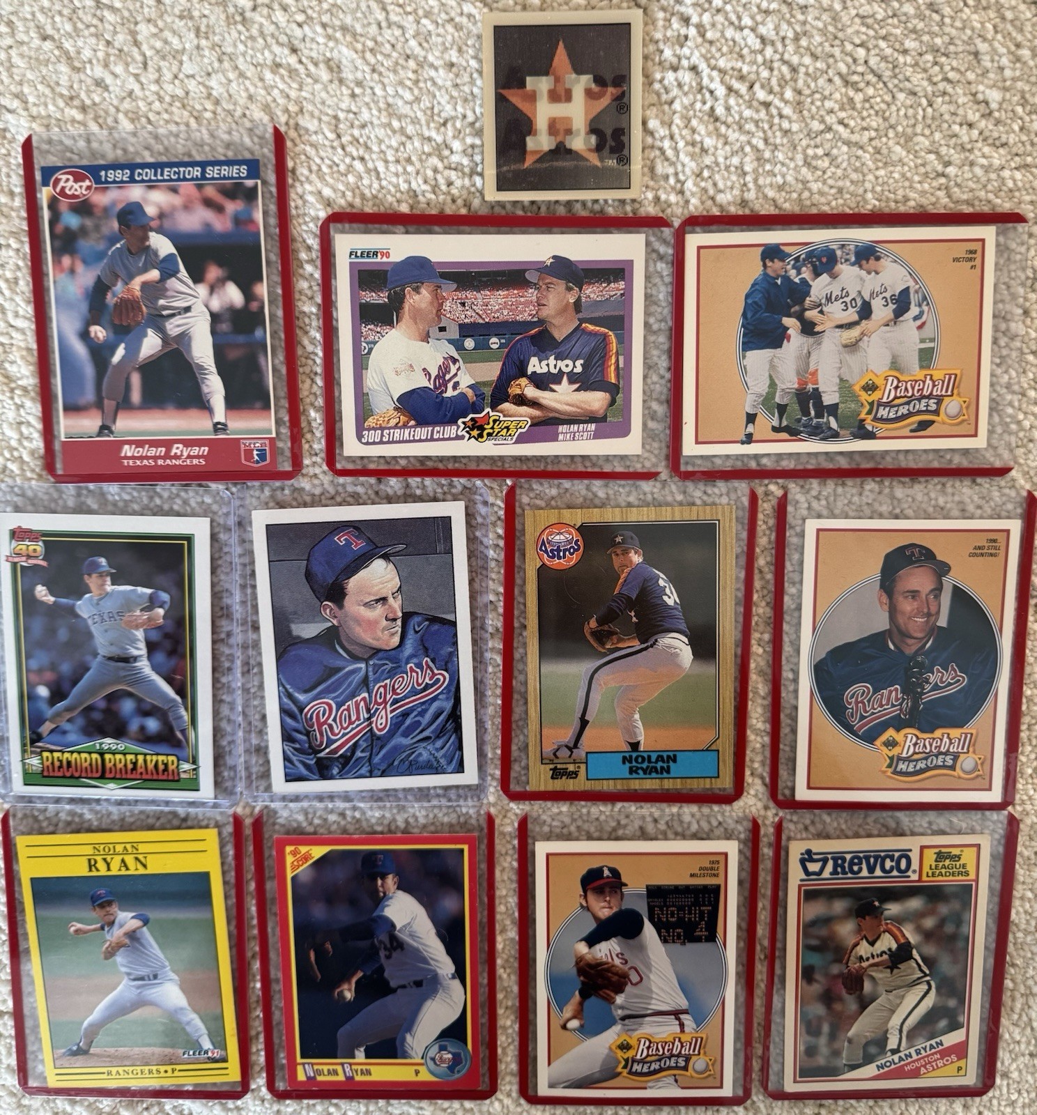 Hall of Fame pitcher Nolan Ryan collector lot featuring a strong mix of Houston Astros and Texas Rangers era cards from the late-1980s to early-1990s. This lot includes base cards, milestone and Baseball Heroes inserts, record-breaker themed cards, and a Houston Astros team logo lenticular-style card. A well-rounded Ryan lot highlighting multiple teams, milestones, and classic designs. Lot highlights: • Multiple Nolan Ryan cards (Astros & Rangers) • Baseball Heroes, Record Breaker, and milestone-style inserts • Houston Astros team logo specialty card • All cards stored in protective sleeves/top loaders A solid vintage Ryan lot for collectors, display, or resale. Ships securely and carefully packaged.