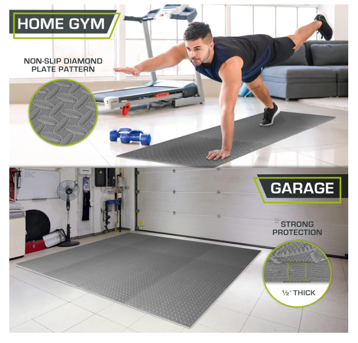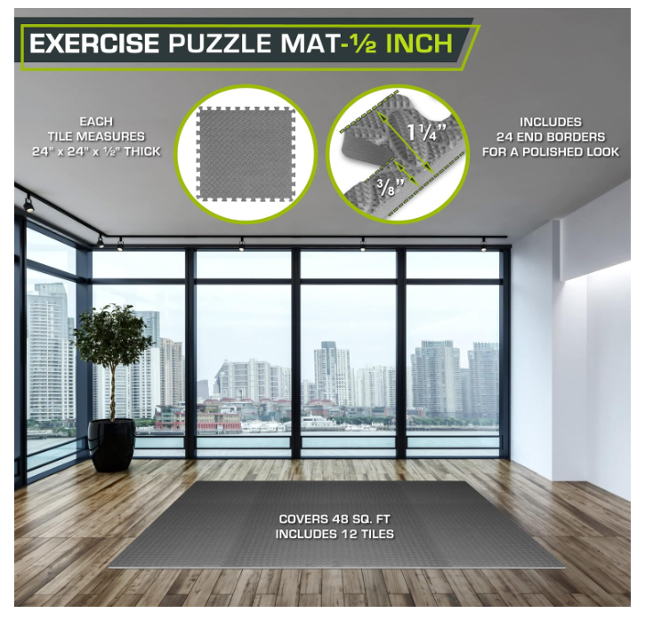 Exercise Mat, Foam Floor Tiles for Home Gym, Mat for Home Workout Equipment ABOUT THIS ITEM: Protective Exercise Flooring - Durable, non-skid textured squares and tiles that cover and protect your floor or even carpet while creating a comfortable workout room with exercise accessories or as a play mat for children. Easy Assembly – Lightweight interlocking foam tiles connect quickly and easily and can be disassembled just as simply for quick storage Versatile – The water-resistant, noise-reducing design is easy-to-clean, great for indoor purposes like in garages as a protector, gyms, a home fitness room, or even children’s play areas as a playmat. Covers 24 Sq Ft - Each Tile measures 24 in x 24 in x ½ in - thick from the highest point of the texture; Includes 6 tiles with end borders for a polished look. Care: Apply warm water and dish soap with a soft cloth or towel and air dry. High Quality Foam - High-density EVA foam mat provides excellent support and cushion; Contains NO toxic phthalates. Excellent alternative to rubber gym mats. SHIPPING: We offer FREE shipping on all orders! We ship within Three business days of payment, usually sooner. We use a selection of shipping services such as UPS, FedEx, USPS etc. We only ship to the lower 48 states, no APO/FPO addresses or PO Boxes allowed. Local pickups and combined shipping options are not provided at this time. PAYMENT: We accept payment by any of the following methods: PayPal Please pay as soon as possible after winning an auction, as that will allow us to post your item to you sooner! FEEDBACK: Customer satisfaction is very important to us. If you have any problem with your order, please contact us and we will do our best to make you satisfied. Thank you for shopping with us!