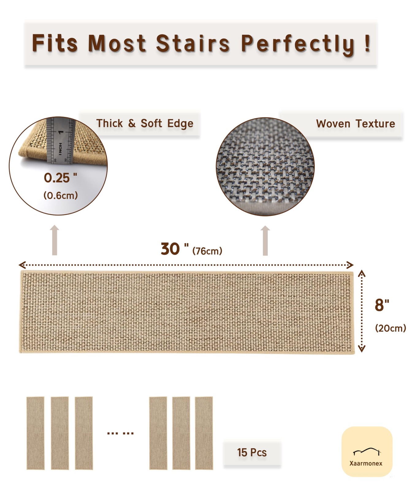 Natural Linen Stair Treads for Wooden Steps【Long-Lasting & Easy maintenance】Each 8" x 30" tread comes in a set of 15, perfectly sized to cover most standard staircases. Easily clean stains with a vacuum, keeping the covers fresh and like new even with long-term use. 15 Pcs 8" x 30" Non Slip Stair Runner, Peel and stick Carpet indoor for kids elders and Pets 【Strong Self-Adhesive Backing】Strong adhesive ensures stair treads stay securely on wood, tile, and marble surfaces without shifting or lifting. 【Peel and Stick, Easy Installation】Clean, peel, and stick for quick setup. Removal the Steair Runners leaves no residue, preserving the stairs' finish. 【Natural Linen Mat: Quiet, Soft & Comfortable】Crafted from natural linen, these treads provide a soft feel and reduce noise for a tranquil home. 【Easy to Clean & Machine Washable】Vacuum daily or machine wash as needed. Durable design maintains non-slip carpet performance and looks over time.For more lasting, please air dry naturally after cleaning, do not use the dryer! 【Long-Lasting & Easy maintenance】Each 8" x 30" tread comes in a set of 15, perfectly sized to cover most standard staircases. Easily clean stains with a vacuum, keeping the covers fresh and like new even with long-term use.
