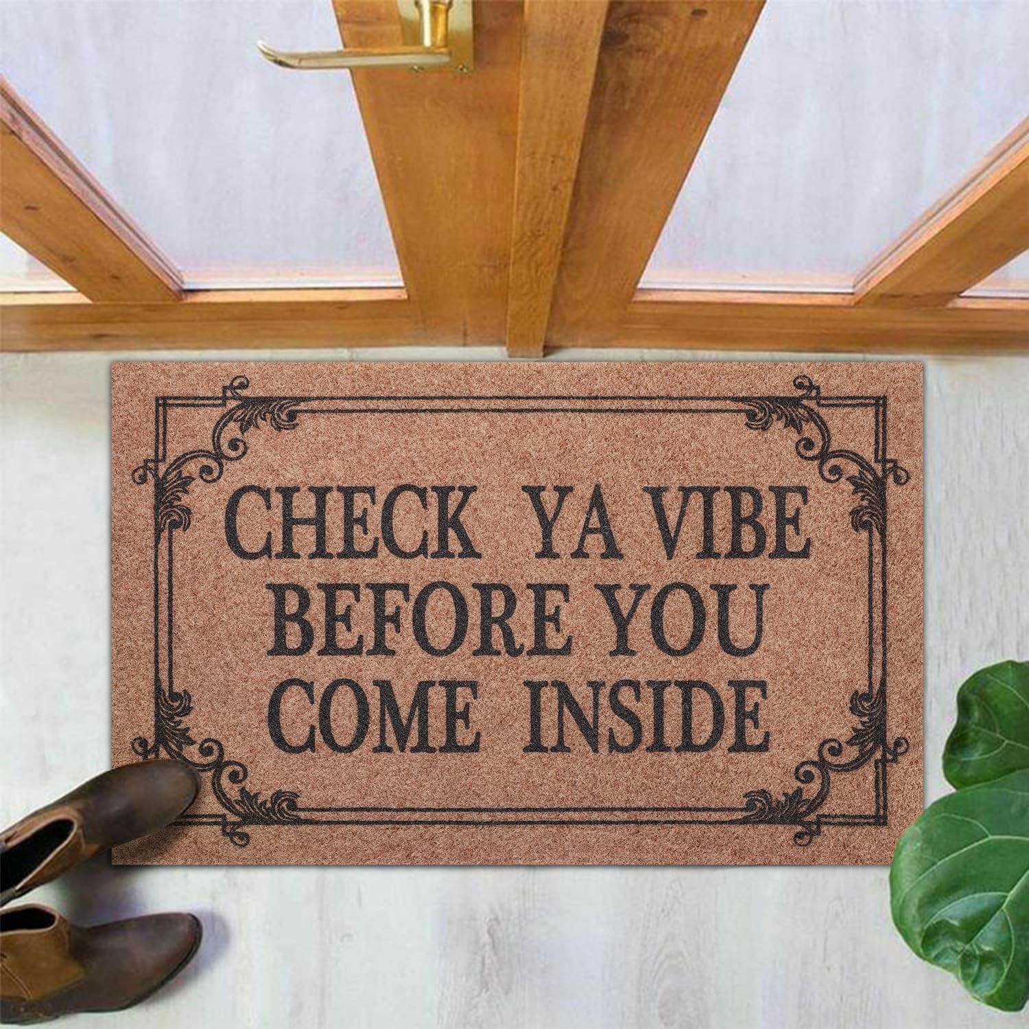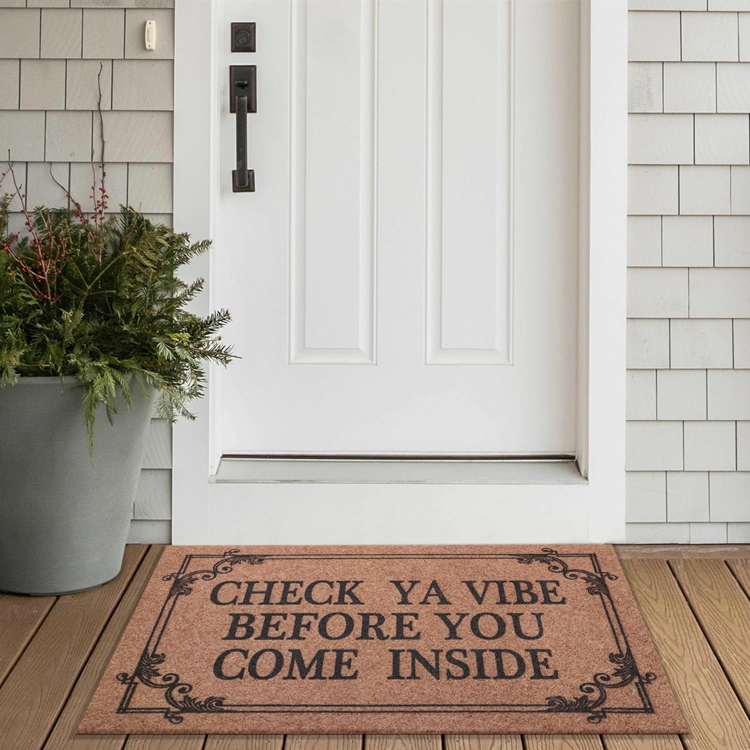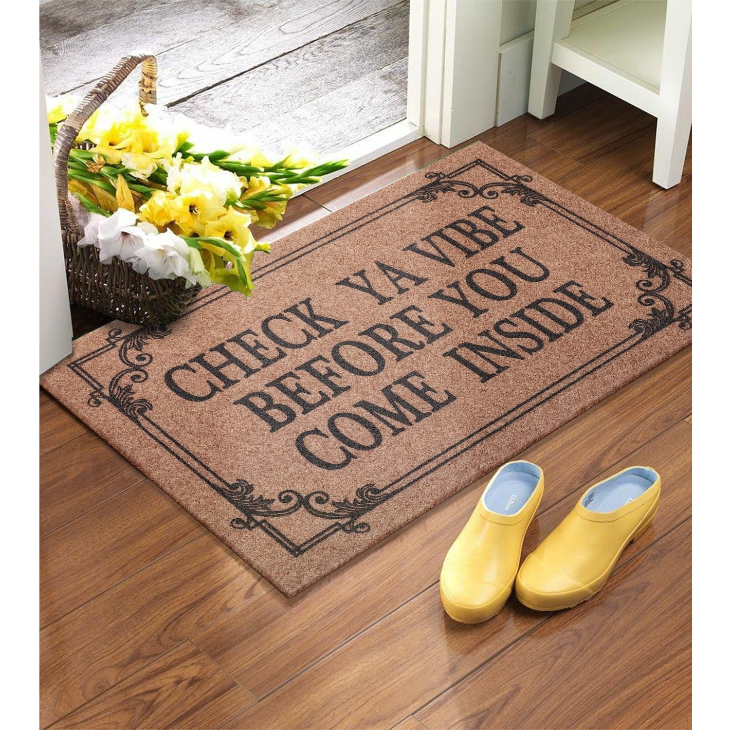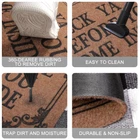 Material: recycled Polypropylene Backing material: non slip Recycled Rubber Package included:1 x Indoor Doormat High Workmanship:Practical and Elegant.Good water absorption and prevent the moisture. Tips:Due to the shipping reason, the mat tiling for a period of time or put some books on it to flatten it down. A Colourful Stylish Doormat for Your Home Decor The entrance colorful welcome mat give a great first impression to your home before you even open your door. Let your inside entry way doormat do the talking with style and elegance. Quick Catch Dirt Dust The concave word and convex border helps the multi-purpose mat to trap dirt more effectively. Our door mat excellent at providing a barrier for moisture and dirt, and this magical non slip doormat as rugs for entryway to make your life easier. Keep floor clean and dry. Durable Doormat Our mat is designed with a strong beveled border that helps to form a retention dam to trap mud or other messy unwanted debris from tracking into your home. Low Profile Design With this low profile design mat, the door will open easily so forget about curling or getting stuck. Our door mat is ideal for low-clearing doors or entryways. Cleans Like New Simply vacuum with a hand-held or full sized vacuum or shake off outdoors. For a deeper clean, use a garden hose to rinse the mat outdoors. Your mat will be as good as new. Soft and Durable Doormat The entrance door mat rug is soft enough for your bare feet, but also durable enough for your dirtiest boots. The stylish colors and patterns will complement any decor and help keep your floors clean and tidy. MATERIAL AND LOW PROFILE DESIGN : Our non slip rubber doormat inserts a large number of wear-resistant Polypropylene loop on the surface. it is designed to be sturdy, yet soft.The Low profile doormat measures 28”L x 18”W ×0.3”H ,The low profile design prevents the house mat from catching when opening and closing doors. OUTSIDE AND INSIDE USE:The home mat can be used indoors and outdoors as an welcome rug, front door mat as well as be placed at a back door, patio, garage, lobby, balcony, office, stairs, laundry, kitchen, bathroom, toilet, living room, entryway or indoor bedroom or kitchen doors any high traffic entryway. CAPTURE DIRT AND EASY TO CLEAN: Funny writing style and raised edges help this versatile mat more effectively capture dirt,removes debris better than other outdoor mats.This doormat runner helps to scrap off dust, grit, mud, sand,grass or snow and absorb moisture from shoe.The doormat indoor entrance can be cleaned quickly,just spray water over the outdoor rugs to get cleaned or by hand with a vacuum cleaner. Non slip BACKING:The outdoor doormats for entrance way outdoors has a powerful natural non skid rubber which prevents moisture leaks, that is safe for your floor ,and Our door mats will be remained in high-traffic areas, ensure a safety using.Our durable mat can be used for much longer time. UNIQUE PATTERN : Funny doormat with rustic decoration design makes your home or office feel friendly and welcoming. Welcome doormats , ideal for friends and family.