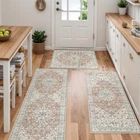 These kitchen mats are a game-changer! Super comfy to stand on, even during long cooking sessions—my feet don’t ache anymore. Love the stylish neutral colors and vintage pattern that blends perfectly with my decor. They stay firmly in place, no slipping, and cleanup is a breeze—just toss them in the wash. Versatile too—great for the kitchen, laundry room, or even as a cozy spot for my pet. The set of three covers plenty of space, and the low pile makes them easy to vacuum. Highly recommend!