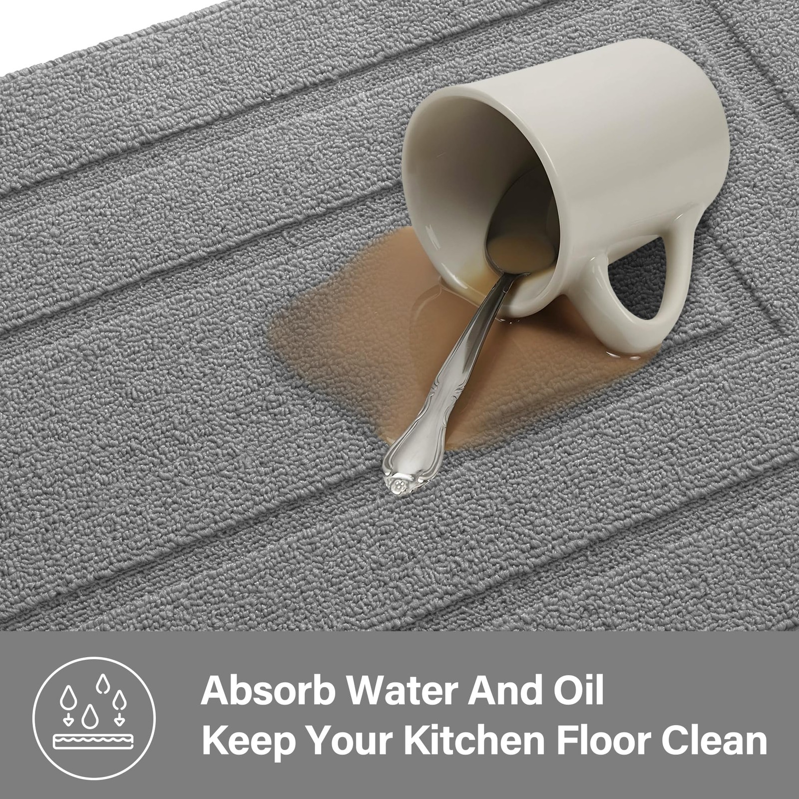 Upgrade your kitchen with Kitchen Mats, designed for comfort, safety, and durability. Whether you're cooking, washing dishes, or doing laundry, these soft and thick kitchen floor mats provide the perfect blend of support and style. Design for Safe - The non-slip design of this kitchen floor mat features a high-quality, textured backing that keeps it securely in place, even on slippery floors. Whether you're cooking, cleaning, or standing for long periods, the mat stays put, providing stability and safety to prevent slips and falls in the kitchen. Gentle on Your Feet - The thick, cushioned material of this gray kitchen mat provides superior comfort for your feet, reducing fatigue during long periods of standing. Whether you're cooking, washing dishes, or prepping meals, the soft surface offers extra support, making your time in the kitchen more comfortable and enjoyable. Water-Repellent & Stain-Resistant – Designed with a water-repellent surface, this kitchen floor runner helps prevent moisture from seeping in, keeping it fresh and long-lasting. Spills and stains stay on the surface, making cleanup quick and effortless. Perfect for busy kitchens, it helps maintain a clean and tidy space with minimal effort. Easy to Maintain – just wipe with a damp cloth or toss it in the washing machine for a quick refresh. The durable material resists stains and retains its quality, making it hassle-free to care for while ensuring it stays looking fresh with minimal effort. Versatile Mat - Perfect for multiple spaces, the mat’s durable, slip-resistant design makes it ideal for the kitchen, laundry room, entryways, and more.