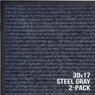 Welcome to the family of indoor outdoor floor door mats for the entryway. Our product comes in a value 2-pack that is steel gray and black ribbed color perfect for high traffic areas. Perfect for the front, side or rear doors. Place them inside around the entryway, bathrooms, kitchen and more. Includes:2 Door MatsSize: 30" x 17" Color: Dark Steel Gray/Black Includes 2 Indoor Outdoor Floor Mats: Enjoy two amazing heavy duty high quality ribbed polyester door mats (30" x 17") that will be perfect welcome for the everyday home. Amazing value 2-Pack Steel Gray/Black Color. Durable, Safe & Easy Maintenance: Cleaning and maintaining your indoor outdoor rug mat has never been so easy. Shake the mat, sweep the rug, or hose off and dry the entryway mat - it's that simple. Environmentally Friendly Doormats: The large mats are made of high quality polyester and recycled PVC and includes non slip backing which prevents moisture leaks while keeping the mat in place. Ideal Front Door Floor Mat Use: Indoor, outdoor, porch, kitchen, side, front door, entryway, hall, patio, garage, laundry, bathroom, dog mud, or any location that sees a good amount of foot traffic. Perfect for keeping your floors clean as the ribbed material helps scrape dirt and debris from shoes. Please Read: We advise customers to measure your area before purchasing. This door mat is apx. 30" wide x 17" tall.