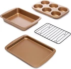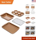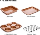 Non-Stick Toaster Oven Bakeware Set 4-Piece, Carbon Steel, Easy to Clean and Perfect for Single Servings, Copper FOUR PIECE SET INCLUDES: " x " Cookie Sheet and Rack, 6 Cup Muffin Pan, " x " Cake Pan TOASTER OVEN'S BEST FRIEND: This multipurpose toaster oven baking set is built to perform and last. Extra durable construction offers even heat distribution. The superior non-stick coating prevents food from sticking. Use this set to make meals, snacks, desserts and more all inside your toaster oven! DISHWASHER SAFE: This toaster oven baking set is 100% dishwasher safe, saving time on clean-up. NON-STICK SURFACE: The non-stick surface on each pan releases foods effortlessly. PERFECT FOR SMALL SPACES: This toaster oven set solves space concerns in dorm rooms, apartments and AND CARE: The advanced non-stick technology is water-based and manufactured without PFOA. Rely on this BakeIns™ bakeware set for exceptional baking performance in your toaster oven. The toaster oven-size cookie sheet with rack, muffin pan and cake pan will help you fulfill most everyday baking missions without having to fire up the full-sized oven. Great idea for those with compact kitchen spaces, including students who live in dorms and urban dwellers with studio apartments and efficiencies. The BakeIns four-piece non-stick bakeware set is constructed of durable carbon steel for even heating and browning. Our proprietary Free + Clear™ non-stick coating is safe, made without BPA, PFOA or PTFE, and offers effortless food release. These toaster oven-size baking pans are dishwasher safe and easy to clean.