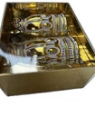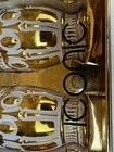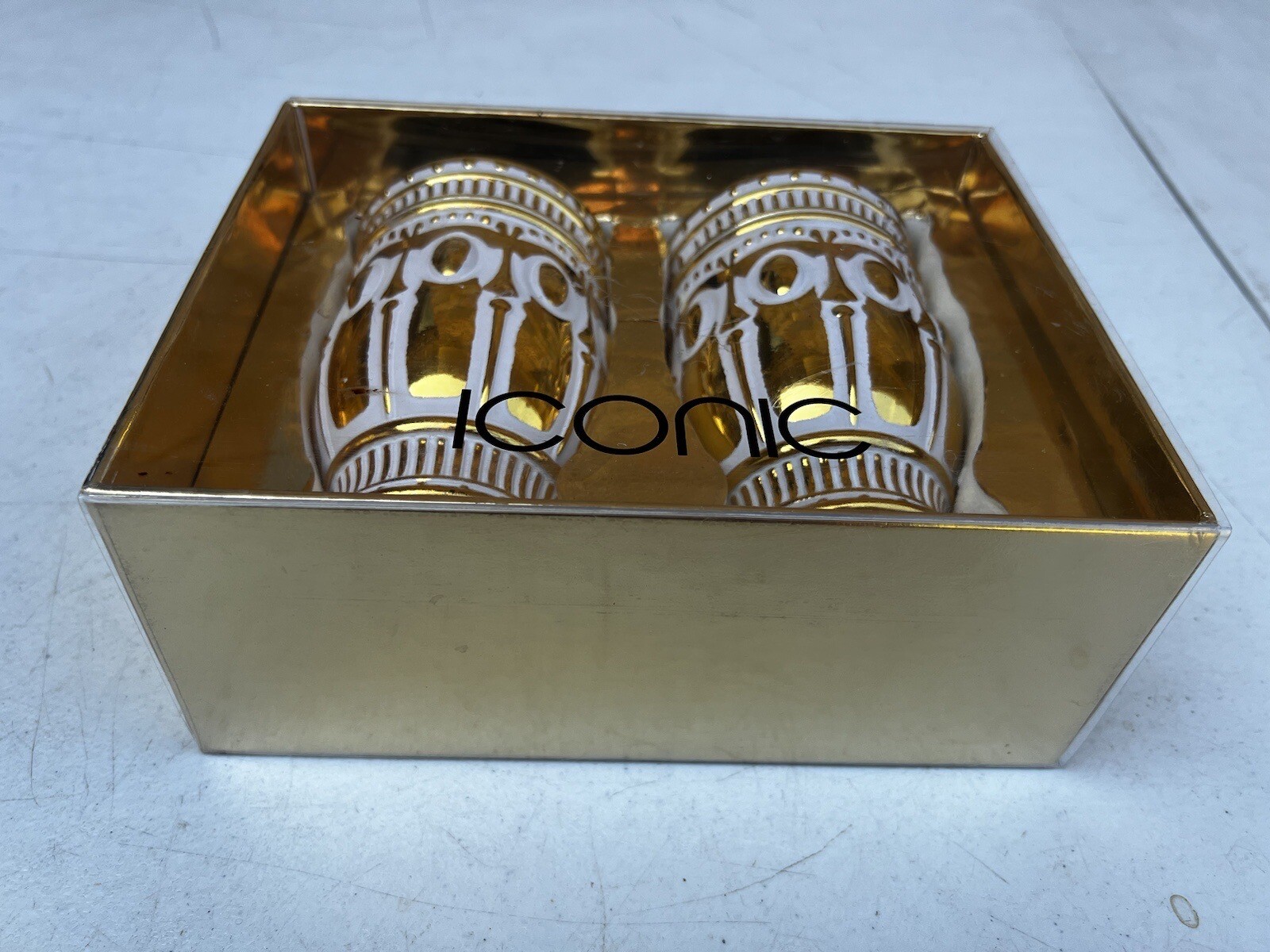 This stunning drinking glass is a must-have for any stylish home. The iconic design features a beautiful white and gold color scheme, adding a touch of elegance to any table setting. Crafted from high-quality glass, this two-piece set is both durable and functional, perfect for everyday use or special occasions. With its unique shape and exquisite details, this glassware is sure to impress your guests and elevate your dining experience. Whether you're sipping on your favorite beverage or entertaining friends and family, this drinking glass is the perfect addition to your collection. Bin Me. 9-12-23. Box Whith Wear.