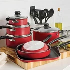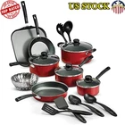About this item Set Includes: 8" saute pan, 9" deep saute pan, 11" griddle, 1 Qt sauce pan with lid, 2 Qt sauce pan with lid, 3 Qt sauce pan with lid, 4 Qt dutch oven with lid, stainless steel foldup steamer, solid spoon, slotted spook, solid turner, slotted turner, pasta spoon and ladle. Nonstick Coating: The patterned interior nonstick coating ensures food slides off easily, making cooking and cleanup a breeze. Durable Construction: Made from high-quality aluminum, this set is designed for long-lasting use. Heat-Resistant Glass Lids: The tempered glass lids are heat-resistant, shatter-resistant, and transparent, allowing you to monitor your meals as they cook. Stay-Cool Handles: Riveted handles stay cool to the touch, providing a secure and comfortable grip. Versatile Compatibility: Suitable for gas, electric, and ceramic glass cooktops. Dishwasher Safe: Simplify your cleanup with dishwasher-safe cookware.