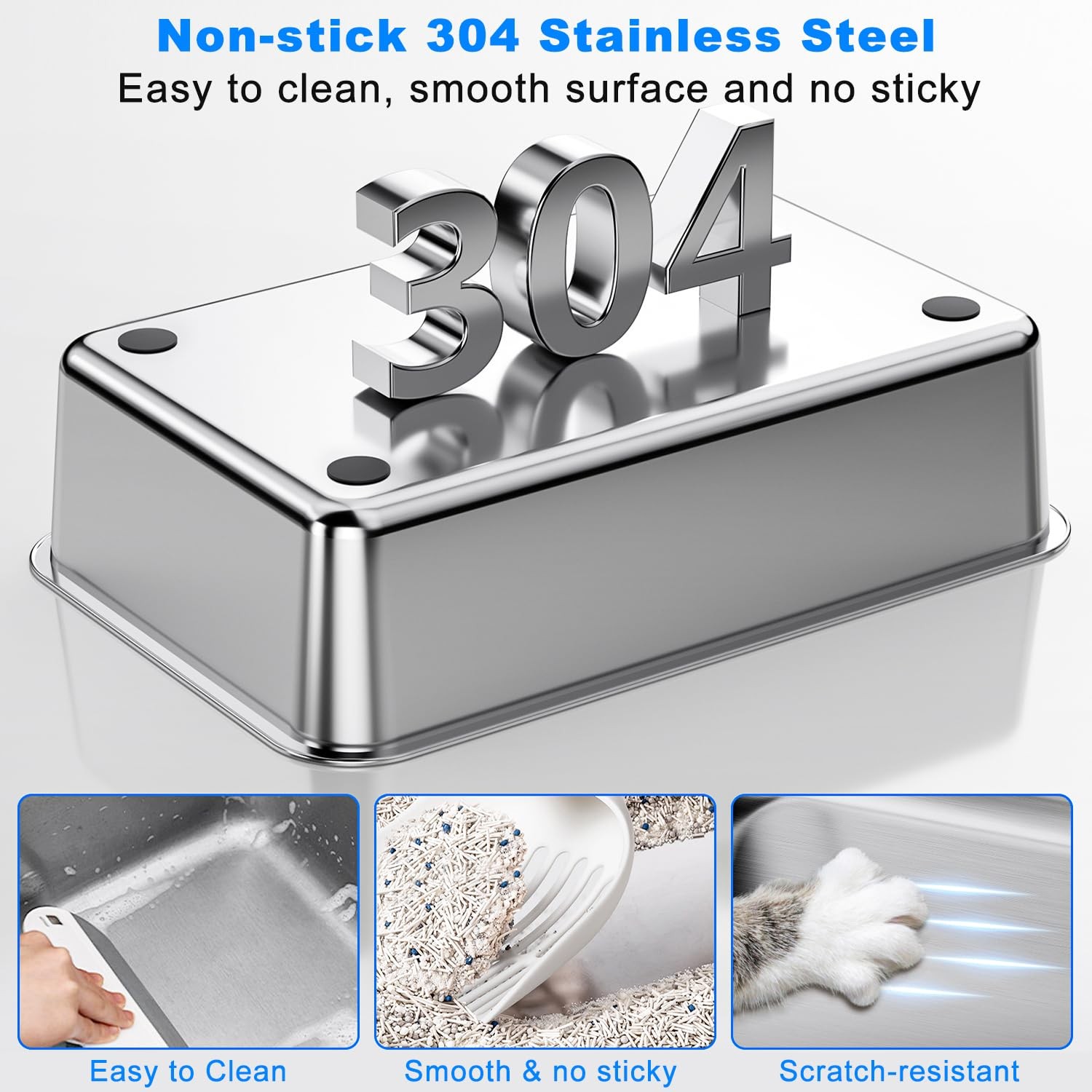 stainless steel cat litter box Side Opening & High-Sided Prevents Urine Leak: The cat litter box with a lid includes a top section that tightly overlaps the bottom. The 6-inch high walls prevent litter from being kicked out, and the side opening prevents cat urine from spilling everywhere Non-stick Stainless Steel Material: Crafted from qualified stainless steel, this stainless steel cat litter box resists rust, scratching, and wear, ensuring longevity. The design of the side open design feature of the stainless steel litter box with high sides, no matter where you place it in your home, it is convenient for your kitten to enter and exit Extra Large Size: The XL cat litter box is made of a stainless steel box + PP lid, measures 23.6x15.9x12 inches(L*W*H) with plenty of space for the cat to move around freely, and the 6-inch litter box depth can hold enough litter Easy to Clean: Non-stick surface of the metal cat litter box with lid makes cleaning easy. Unlike a plastic litter box, the stainless steel cat litter box does not absorb stains or odors, maintaining a fresh environment for your cat Unique Cat Supplies Storage Design: Our Cat litter boxes for indoor cats come with a Cat Litter Scoop/Cat Litter Mat,/Bag,/Stickers. The spoon can be placed in the holder box through the back holes. And the cat litter mat can help collect cat litter. And the bag for you to deal with the waste. And the sticker for you to decorate the box