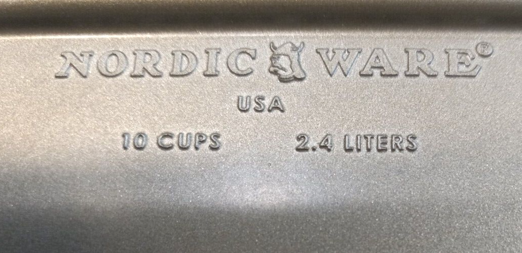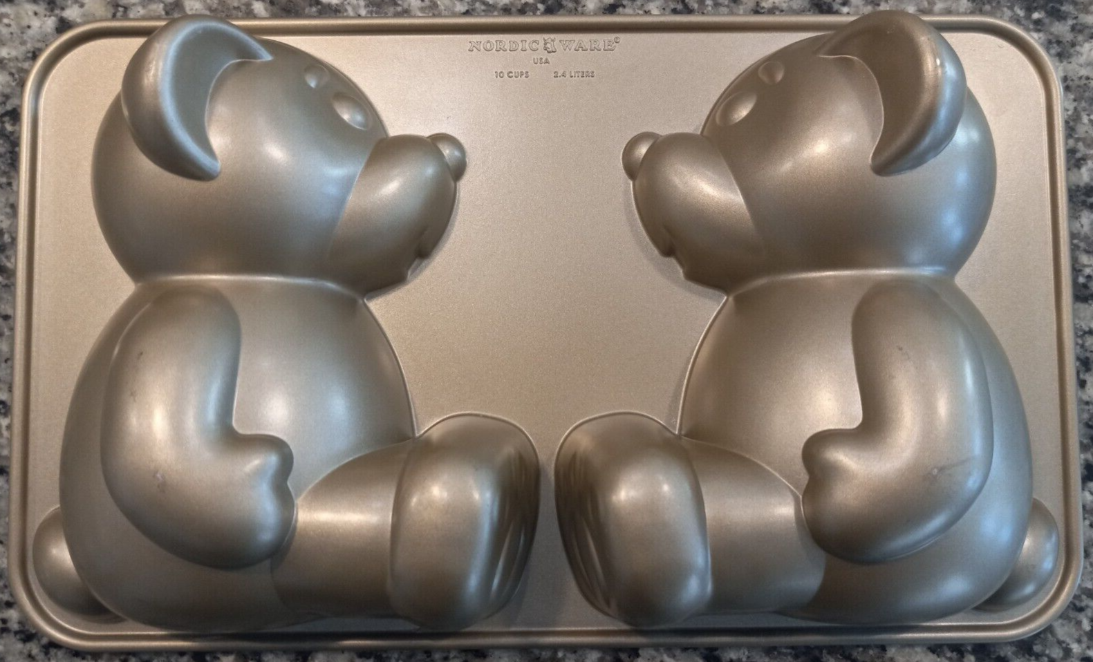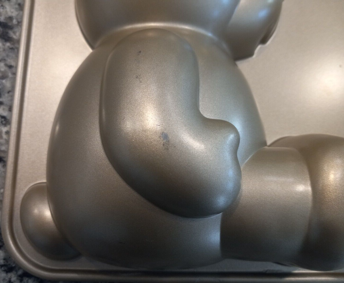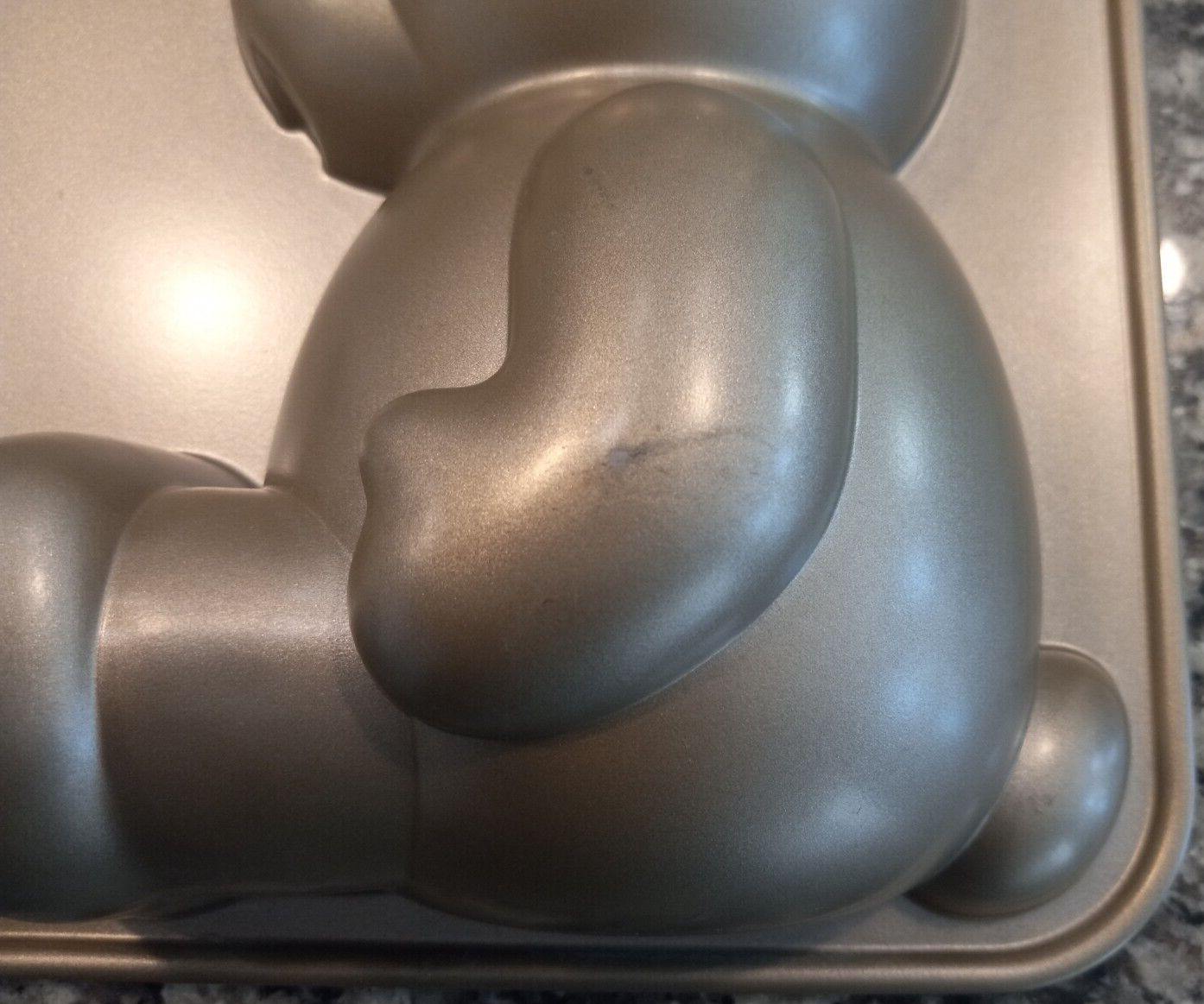 The Nordic Ware Build A Bear 3D Stand Up Cake Pan is a rectangular aluminum cake pan with a gray non-stick surface coating. It has a capacity of 10 cups and features the popular Build A Bear character design. The pan measures 16.5 inches in width and 9.5 inches in length, making it easy to clean and ideal for baking creative cakes. Photo #1 shows the indented side. Photo #3 shows the exterior side where some wear can be noted in photos #4 & 5.