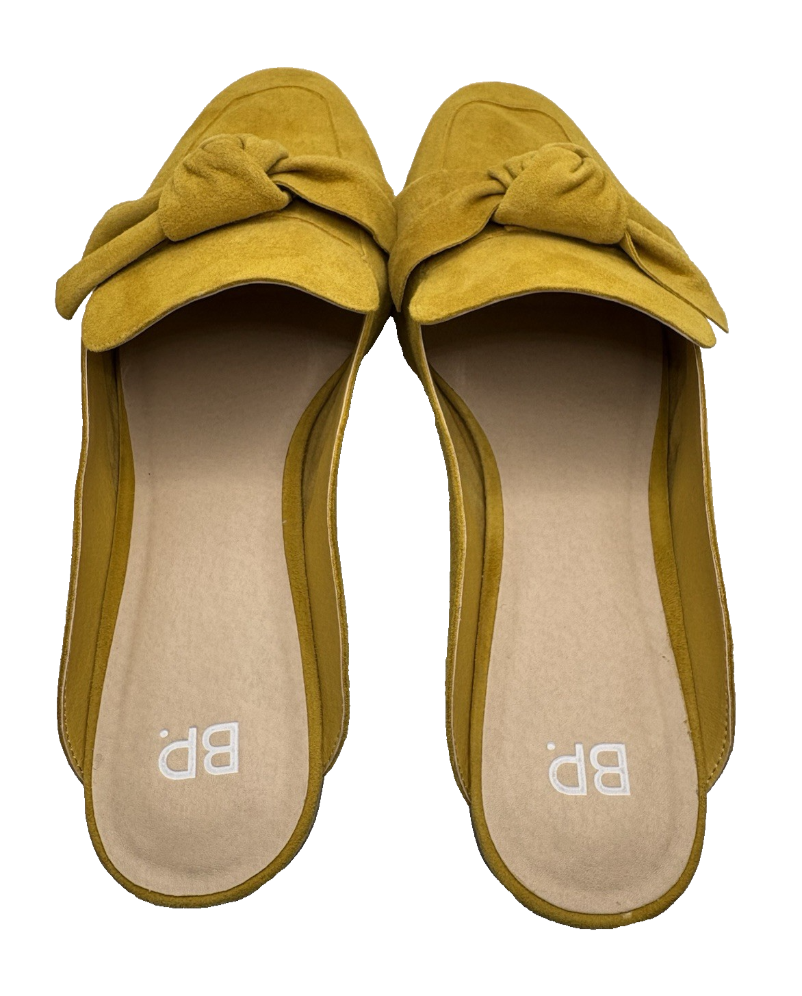 Features:Comfort, CushionedType:FlatColor:YellowPattern:SolidClosure:Slip OnLining Material:LeatherStyle:Slip-OnInsole Material:SyntheticModel:MaddyDepartment:WomenUS Shoe Size:9.5Outsole Material:SyntheticOccasion:Business, Casual, Formal, Party/Cocktail, WeddingBrand:BPSeller Notes:“Great condition - soles have some wear and tear, slight discoloration on right shoe”Accents:BowUpper Material:Suede