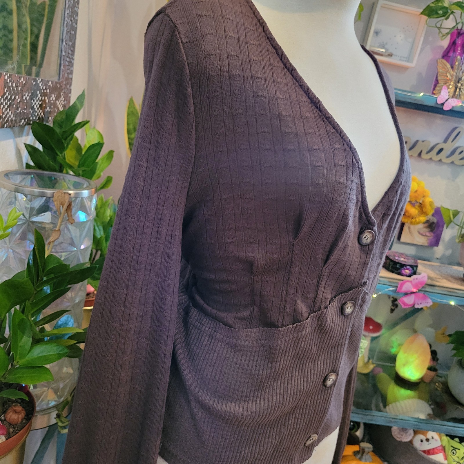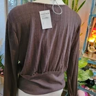 Darling dark brown light weight knit sweater top! Deep v neck with button closure. Ribbed cuffed details. Perfect for layering or worn solo. A must have color this season. Size LARGE Bloomfield NEW with tags Made of 62% poly 34% rayon 4% spandex Approx 19.5" rom armpit to armpit Approx from 19.5" top of shoulder to end of top