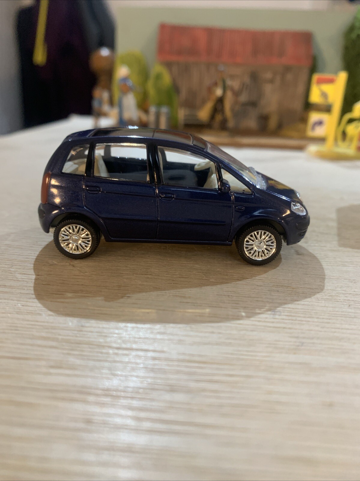 This is a blue 1:64 scale diecast model of a Lancia Musa by Norev. It is a dealer version, brand new in its original box, making it a collectible item for toy and car enthusiasts. The model accurately represents a contemporary Lancia vehicle and is a sought-after addition to diecast car collections.
