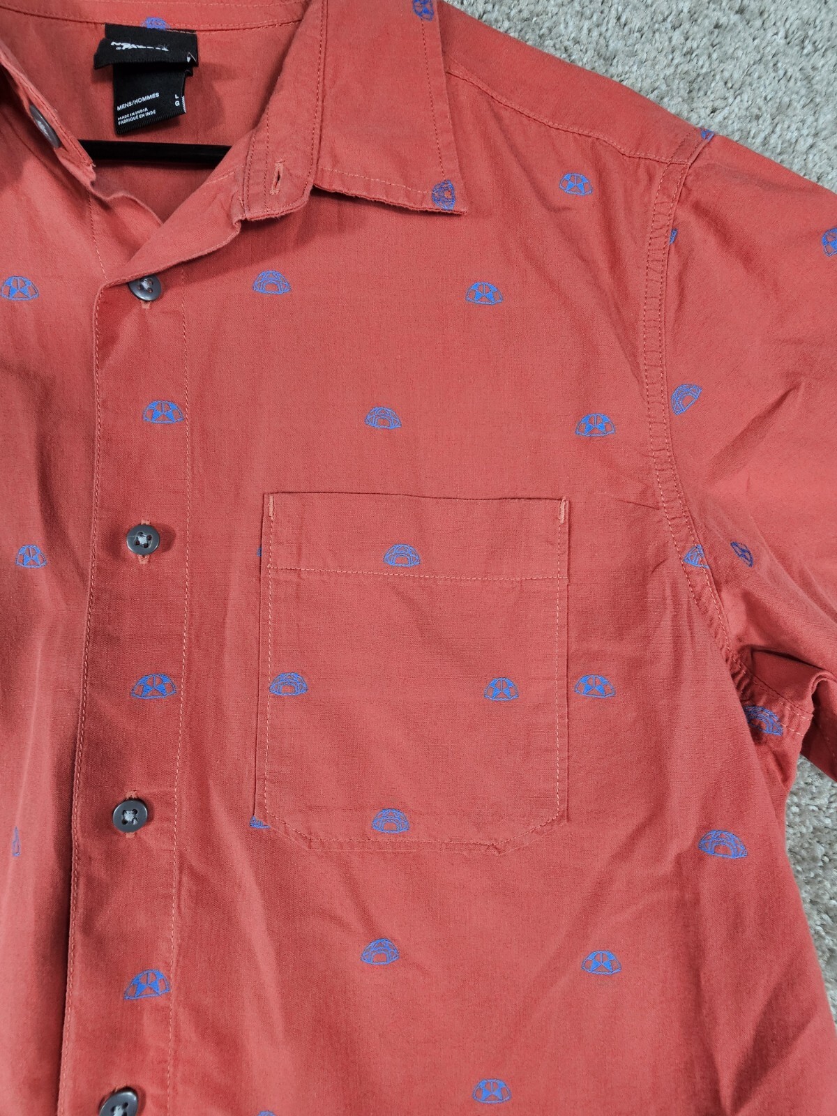 North Face Shirt Button Up Tent Allover Print Red Blue Men's Size Large Preowned Condition This stylish North Face button-up shirt is a must-have for any fashion-forward man. The shirt features a festive Christmas, outdoor, cottagecore, and camp theme with an allover print of tents in red and blue. The shirt is made of a comfortable and durable woven fabric that includes polyester, polyester blend, cotton, and cotton blend materials. The collared shirt has short sleeves and a button closure with accents that add a touch of sophistication. The shirt is perfect for a casual or dressy occasion, and its size L fits most men comfortably. This North Face button-up shirt is a great addition to any wardrobe, and its unique design will make you stand out from the crowd.