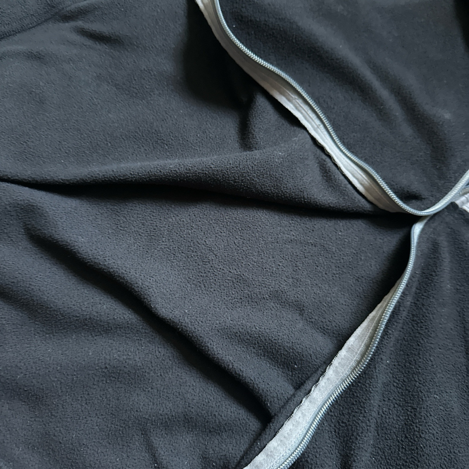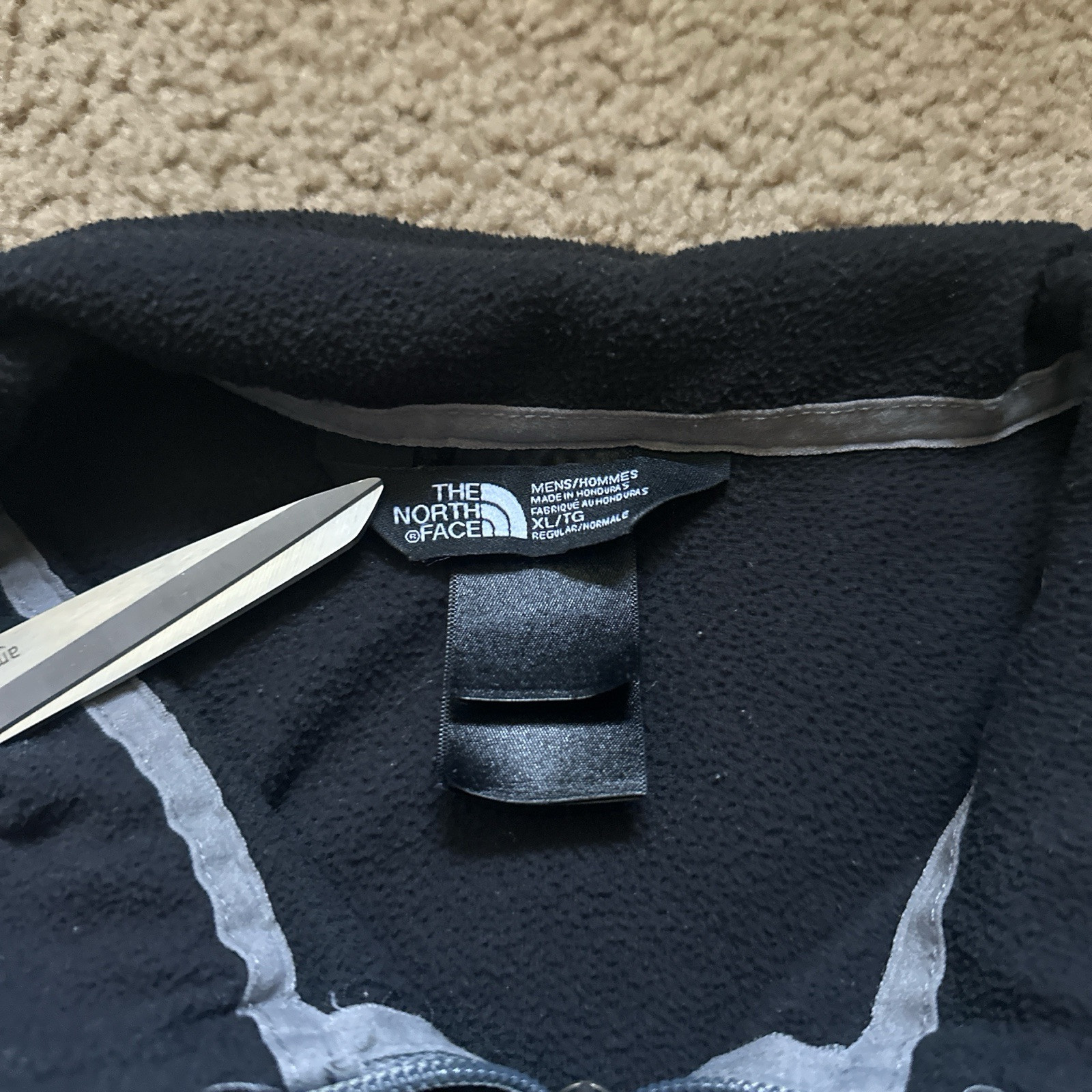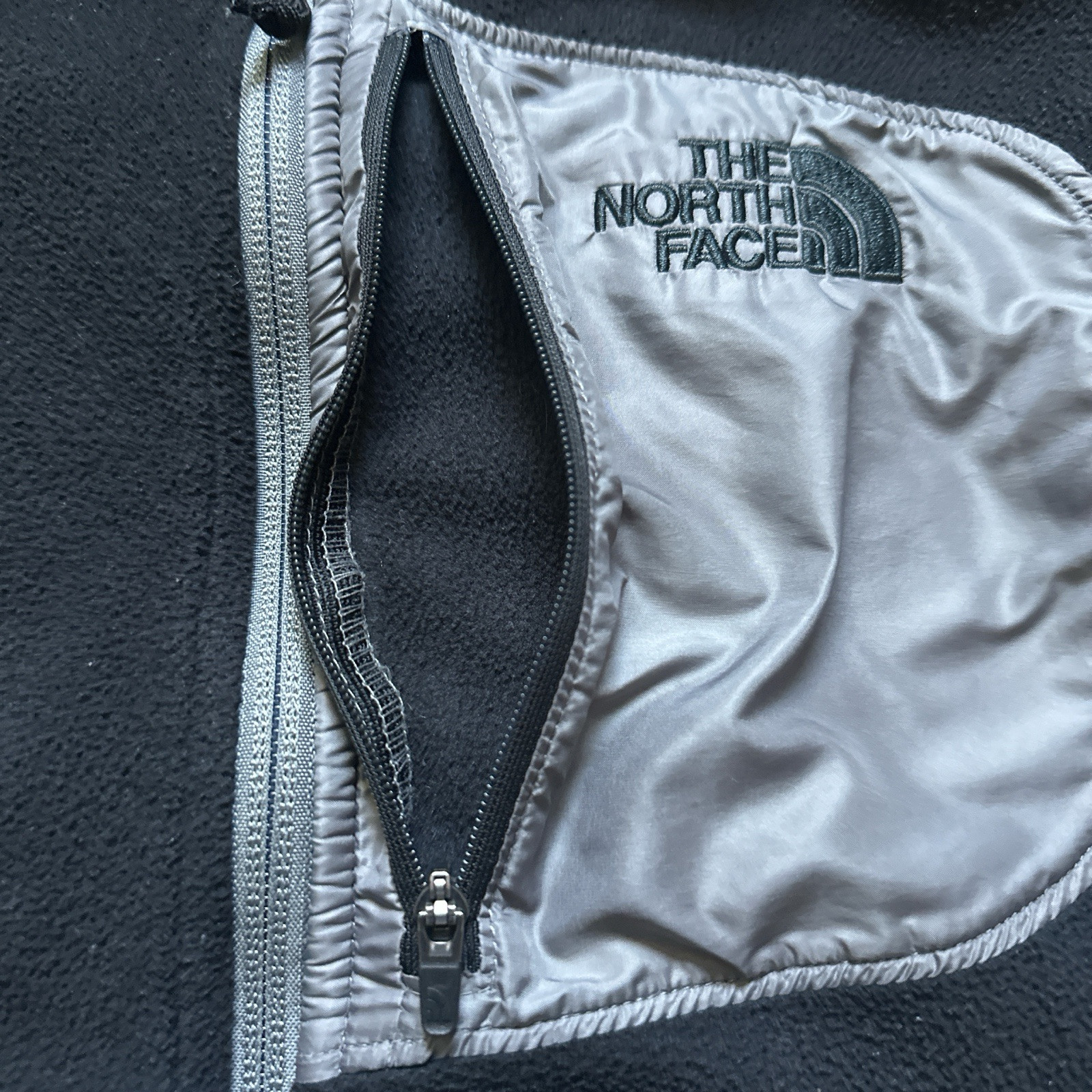 This is a men's XL North Face fleece jacket in black and grey. It features a full zip closure, zipped pockets, stand-up collar, and embroidered logo. The jacket is designed for all seasons with polyester insulation, making it suitable for winter, fall, and spring. It is a basic jacket with a modern outdoor theme, ideal for travel, parties, casual wear, and workwear.