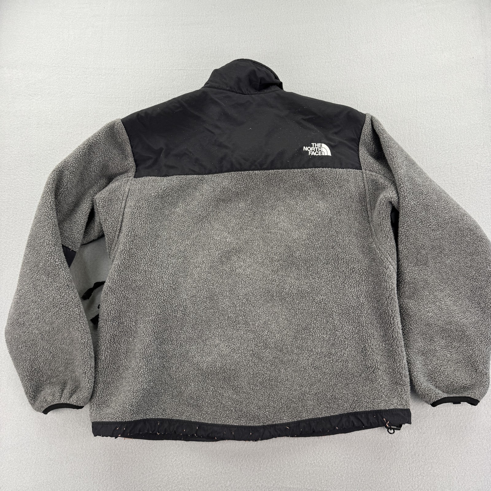 North Face Jacket Womens Medium Gray Black Fleece Softshell Full Zip Outdoors Condition: Good used condition with light wear. Minor lint and slight signs of wash wear. No major flaws or stains noted. Shell exterior A: 100% polyester. Shell exterior B: 100% nylon. Soft fleece body and arms with durable reinforced chest, shoulders, and arms. Features: Full front zipper, high collar, chest zip pocket, two hand zip pockets, adjustable hem drawcord, elastic cuffs. The North Face logo embroidered on chest and upper back. Tag size: Medium (Womens). Made in El Salvador of US materials. Classic two-tone gray and black colorway, ideal for hiking, outdoor activities, or casual wear. Material composition and inner branding shown in photos.