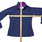 North Face Jacket Womens Small Purple Blue FlashDry Softshell Windbreaker Outdoor Condition: Gently worn, no visible flaws. Clean with minimal signs of wear. Shell: 93% polyester, 7% elastane. Lining: 100% polyester (see tag for details). Purple-blue exterior with magenta fleece lining for added warmth and comfort. Full zip front with two zippered hip pockets and adjustable hook-and-loop cuffs for a secure fit. FlashDry technology for moisture-wicking performance during outdoor activities. Embroidered The North Face logo at chest and back shoulder. 'FlashDry' branding at sleeve. Women's tag size: Small (see measurements in photos for fit reference). Made in Indonesia. Great for hiking, travel, or everyday layering in variable weather.