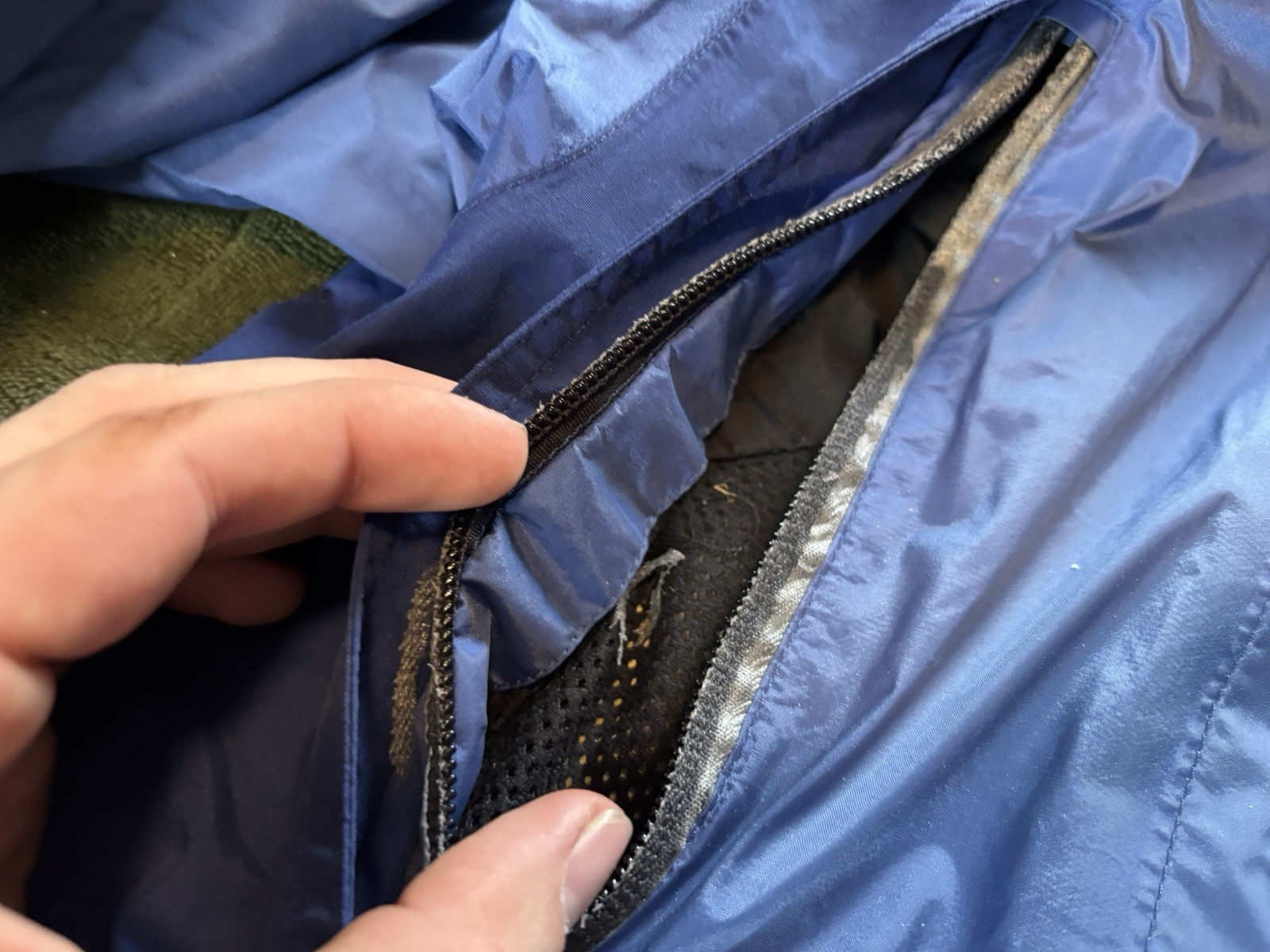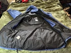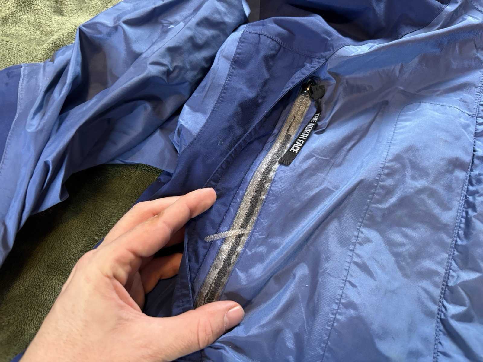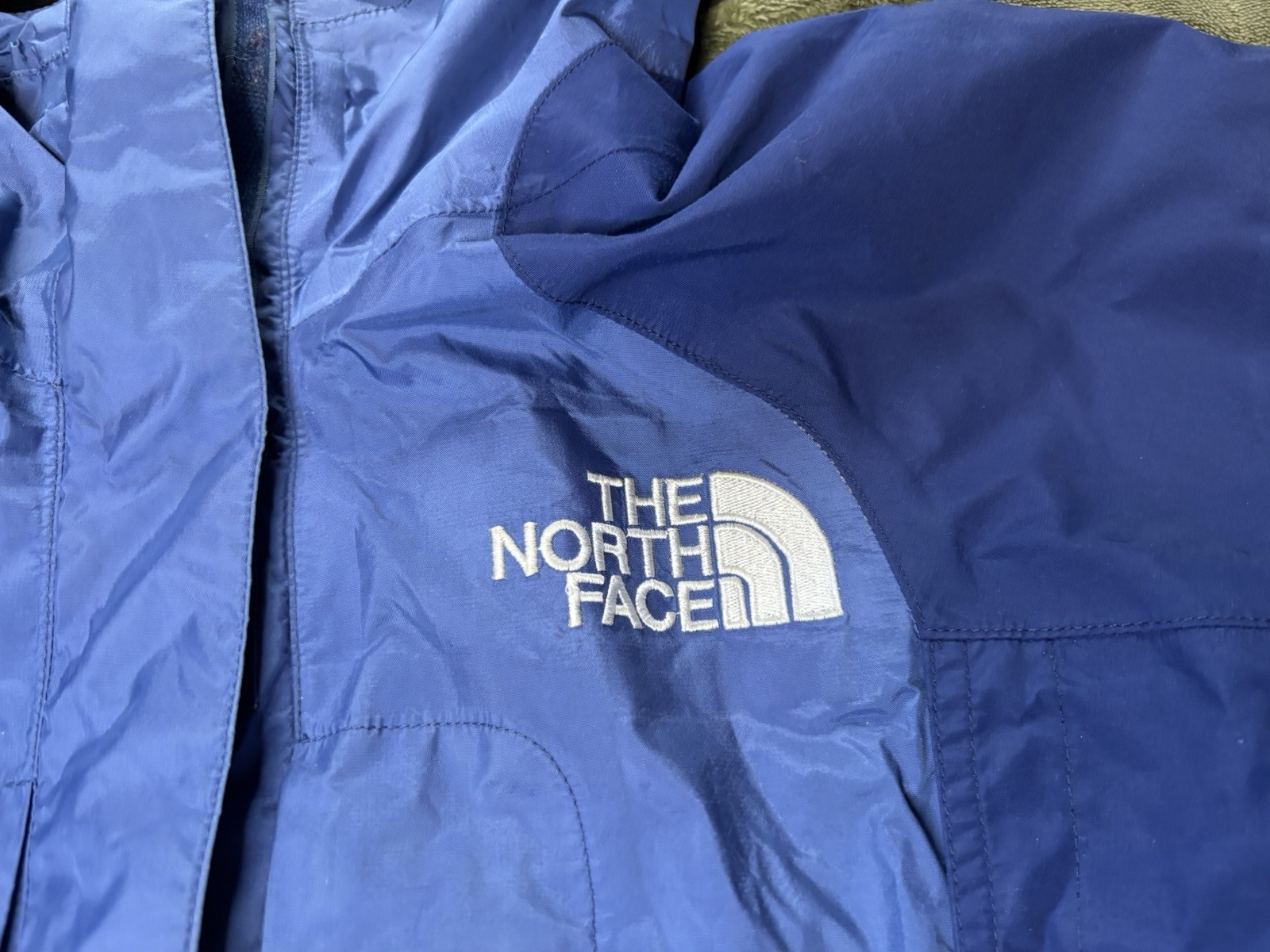 The North Face Women's 3 In 1 Rain Jacket is a versatile and stylish waterproof coat perfect for various occasions such as travel, casual outings, and workwear. Made with durable nylon outer shell material and lined with cozy polyester, this medium-sized jacket features long sleeves, a hood, and a zip closure for easy wear. The classic blue color and solid pattern add a touch of timeless style, while the zipped pockets, moisture-wicking features, and lightweight design make it functional for all seasons. The North Face logo accents give it a touch of authenticity, making it a must-have outerwear piece for any woman's wardrobe. The waterproofing fabric around the zipper pockets is flaking away in multiple spots.