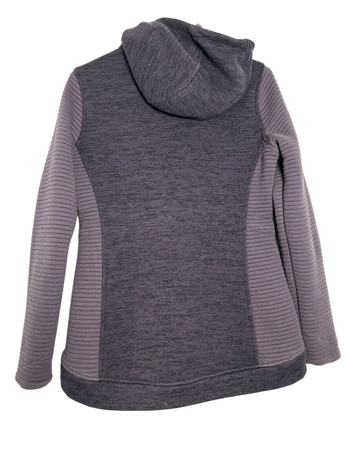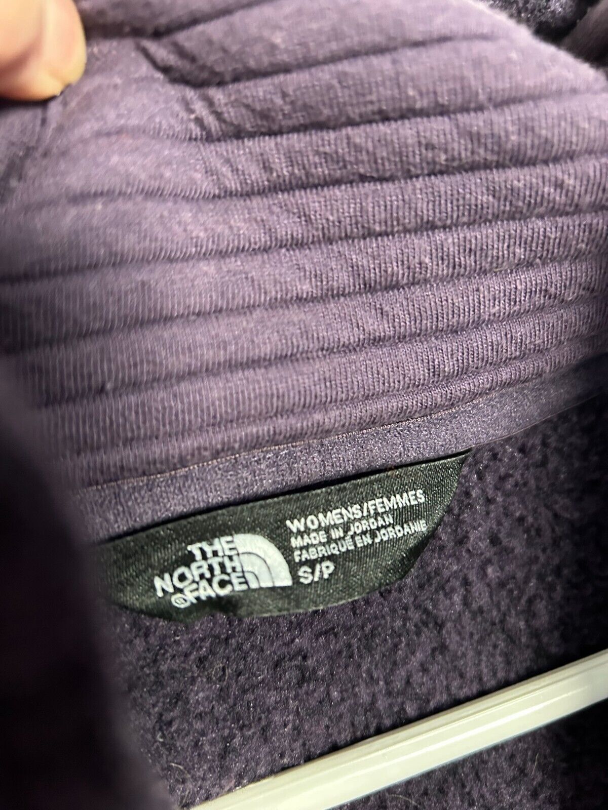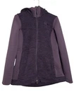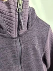 This is a women's "The North Face Indi 2" hooded parka jacket in size small, featuring a purple fleece outer shell with a solid pattern. The mid-length jacket has long sleeves, a zip closure, and is suitable for travel, casual wear, and work. It includes zipped pockets, a full zip, insulated design, and The North Face logo accents, making it ideal for outdoor activities in winter, fall, and spring seasons.