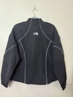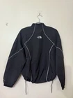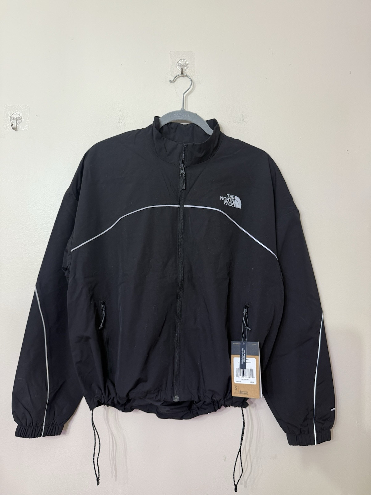 This is a women's black Tek Piping wind jacket from The North Face in size Large. It features a relaxed fit, long sleeves, full zip closure, polyester lining, and nylon outer shell material. The jacket is suitable for travel, casual wear, and workwear during the summer, fall, and spring seasons. It has zipper accents and is brand new with tags.