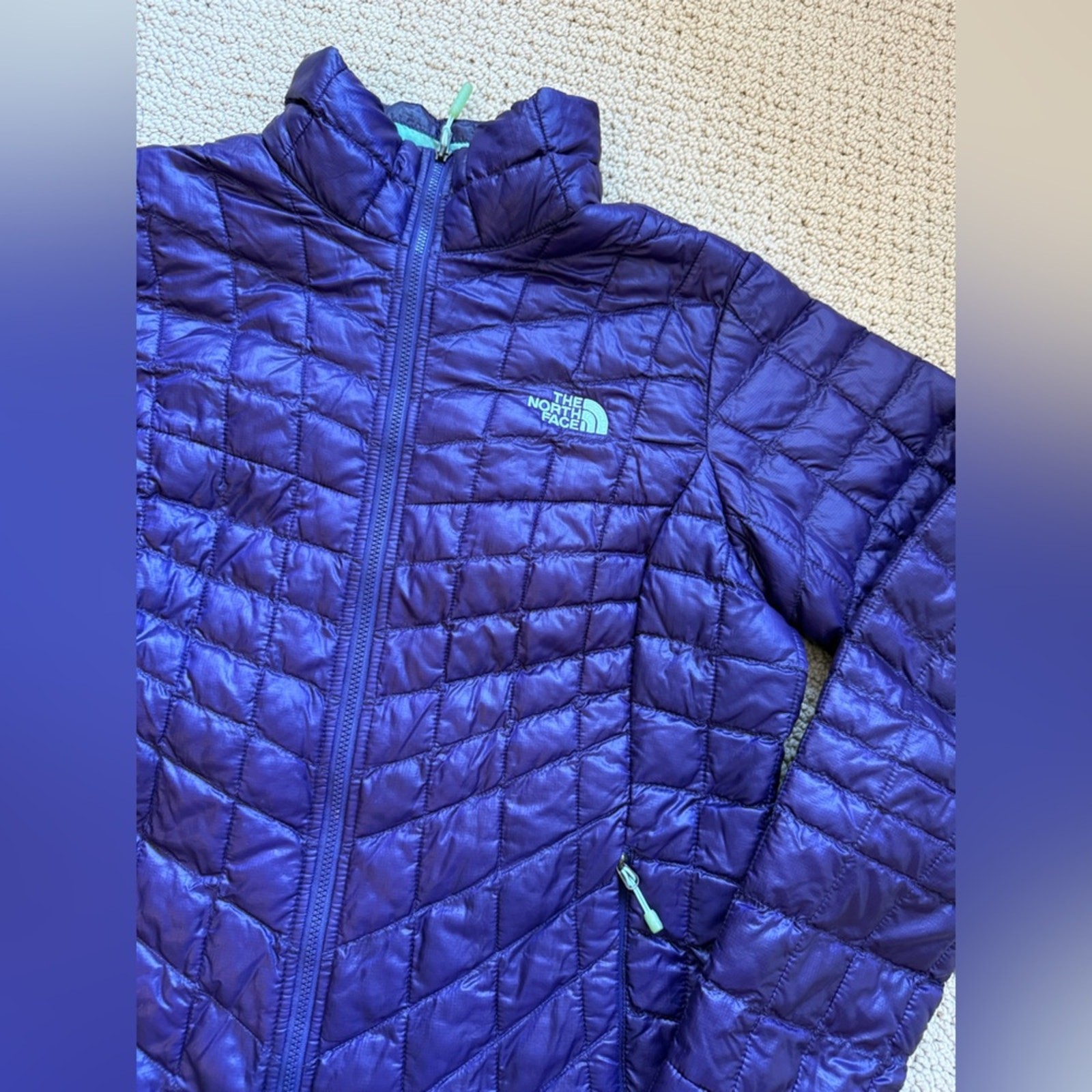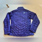 The North Face Women's Thermoball Lightweight Puffer Jacket! Size Small - see approx measurements in pics Purple color Full zip Lightweight, thin material In pre-loved condition- no rips or tears. There is some wear/discoloration on the inner collar (see close up in last pic). Otherwise, great pre owned condition! Please reach out with questions!