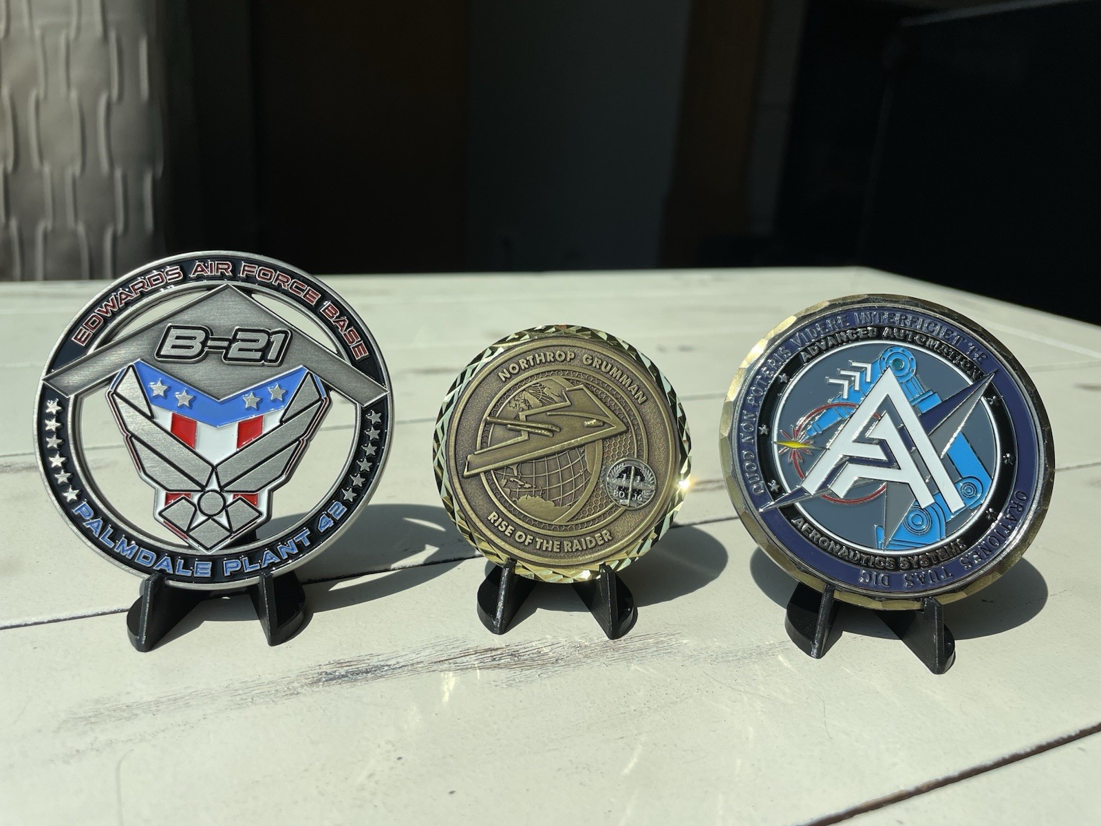 Northrop Grumman B-21 Raider Bomber 3-piece Rare Challenge Coin set. THE PICTURES DON'T DO THESE COINS JUSTICE! EVEN MORE STRIKING IN PERSON! The aliens GLOW IN THE DARK You will receive (3) coins, (3) plastic sleeves, and (3) 3d printed display stands. Will ship using USPS Priority mail to the 48 continental United States ONLY. Will be packaged carefully and well protected! SIGNATURE REQUIRED UPON DELIVERY. NO SHIPPING TO P.O BOXES. Whiteman Air Force Base, B-21 Raider, Challenge Coin, LRS-B, B-52 Stratofortress, B-1B Lancer, Lockheed Martin, F-117 Nighthawk, F-14 Tomcat, F-15 Eagle, F-16 Falcon, F-18 Hornet, F-22 Raptor, F-35 Lightning, United States Air Force, USAF, Navy, USN, Army, Marines.