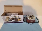 INDOOR FUN: Family night done right. Bring all the excitement of this campfire tradition right into the comfort of your home. Our home smores maker gives you all the equipment to make perfectly roasted s'mores every time FLAMELESS HEATER: Forget the hassle of cutting wood and open flames. This portable unit is built with safety in mind. The electric flameless heater requires nothing but an outlet to start making perfect golden brown s'mores ROASTING FORKS: The indoor marshmallow roaster includes 2 stainless steel forks to keep hands safe from the heater and 4-compartment trays that allow accessibility to share your ingredients with everyone at the table EASY TO CLEAN: This durable smores-making kit has a sturdy base and easy-to-disassemble trays, making it quick and simple to wash after every use NOSTALGIA: From designs inspired by early 19th century America to the timeless appeal of our appliances, we offer unique, novel, and fun products for the family. We preserve the past, embrace the present, and look forward to the future Skip the hassle of building a bonfire and bring the taste of the campfire right into the kitchen with our Indoor Electric S'mores Maker. Build the smores station of your dreams and fill the compartment tray with marshmallows, chocolate, graham crackers, and chocolate chip cookies. This table top smores maker makes any event worth celebrating. Easily set up a s'mores station during parties, family gatherings, or for a cozy indoor camping site Opened but never used. It has been tested and works.