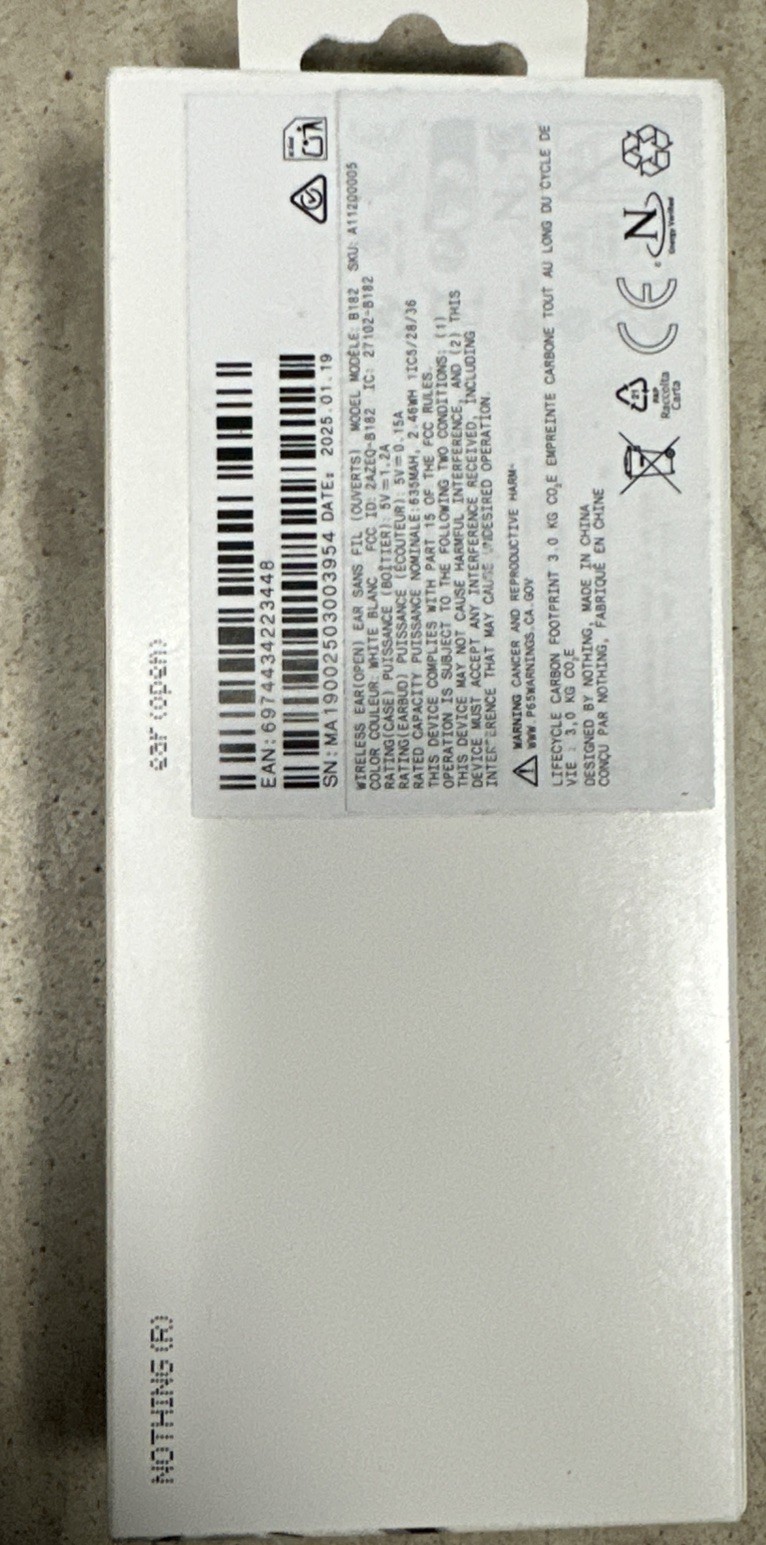 MPN:Does not applyIncludes Rechargable Battery:YesCompatible Devices:Iphones, Android DevicesBatteries Required?:YesBrand:UnbrandedConnectivity Technology:WirelessTarget Gender:UnisexNumber Of Lithium Metal Cells:7Cable Feature:Without CableSeries Number:182Model Name:Nothing Ear(Open)Headphones Form Factor:On EarItem Package Quantity:1Form Factor:Ear-hookBatteries Included?:YesWeight:0.31 PoundsWireless Communication Technology:BluetoothPackage Dimensions LxWxH:6.61x2.83x1.06 InchesControl Method:RemoteCountry of Origin:ChinaConnectivity:Does not applySize:Standard SizeHeadphones Ear Placement:On Eargtin13:Does not applyColor:WhiteMaterial:Silicone, PlasticAge Range Description:AdultSpecific Uses For Product:SportEarpiece Shape:Angled Ear HooksBluetooth Version:5.3UPC:Does not applyModel Number:B182Number Of Lithium Ion Cells:3Model:Does not applyType:Does not apply