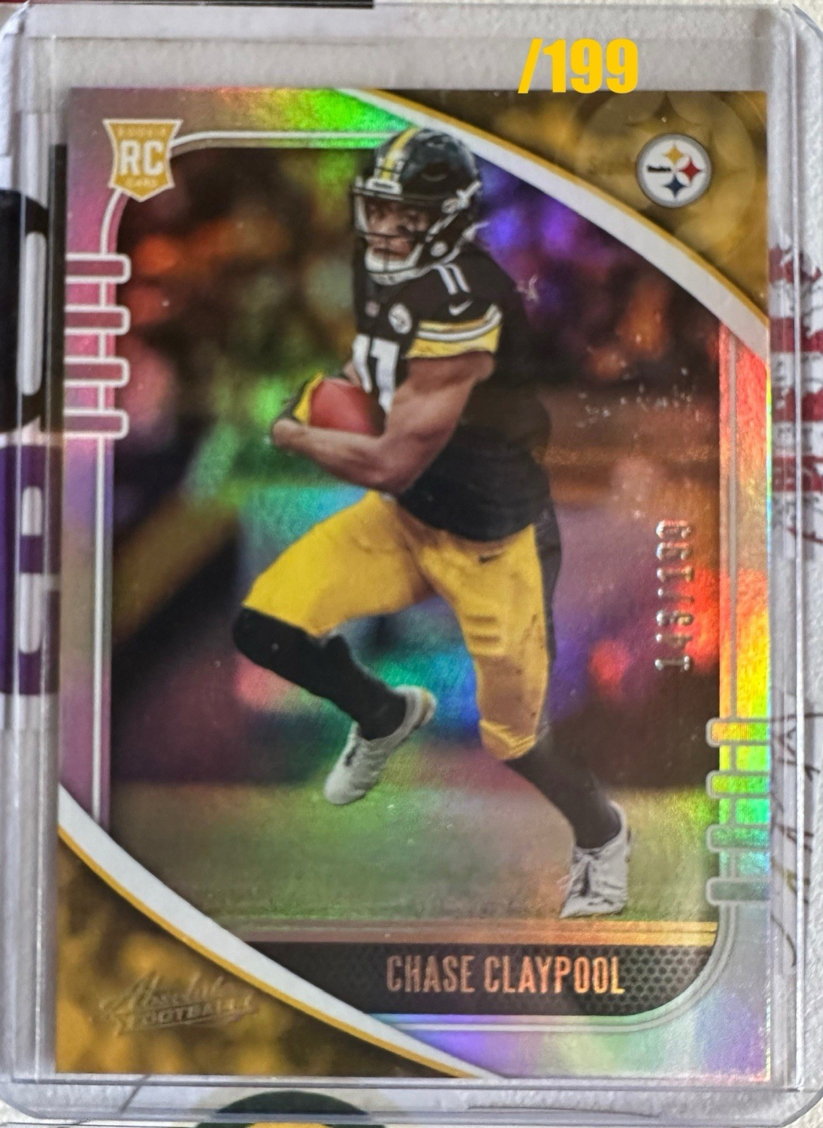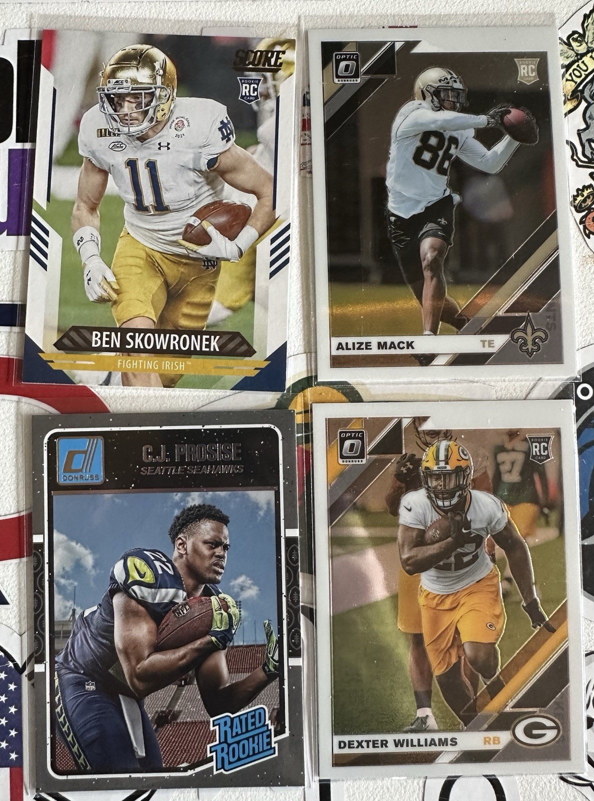 8 cards pictured included: 1. 2021 Prizm DP Green Chase Claypool #54. /199 2. 2020 Absolute Gold Hobby Rookie Chase Claypool #116(143/199). 3. 2016 Donruss Rated Rookie Will Fuller #400. 4. 2018 Donruss Rated Rookie Equanimeous St. Brown #343. 5. 2021 Score Rookie Ben Skowronek #333. 6. 2019 Donruss Optic Rookie Alize Mack #139. 7. 2016 Donruss Rated Rookie CJ Prosise #354. 8. 2019 Donruss Optic Rookie Dexter Williams #146.