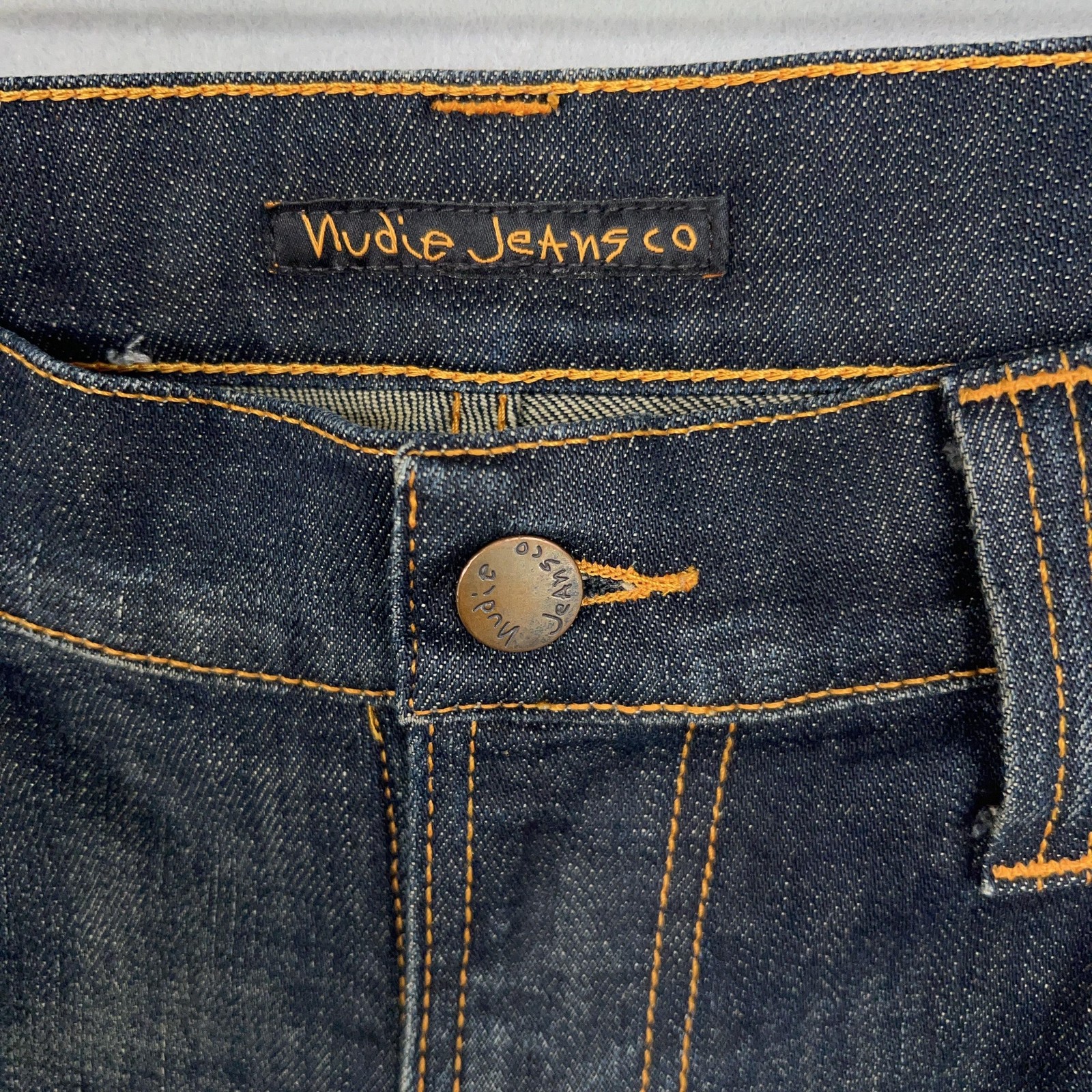 Nudie Jeans Co Jeans Men 33x34 Dark Blue Skinny Organic Cotton Denim Sustainable Condition: Good pre-owned condition — light wear and natural fading/whiskering; no holes, tears, or stains noted Brand: Nudie Jeans Co Tag size: 33x34 (Mens) Material: 100% organic cotton (interior pocket tag states "ORGANIC 100% ORGANIC COTTON") Color/Wash: Dark indigo blue with natural fade Fit: Skinny fit with tapered leg Features: Five-pocket styling; contrast orange stitching; signature back pocket wave embroidery; Nudie-branded top button and rivets; leather waistband patch with "N" logo Interior detail: Pocket bag print includes "The Naked truth about denim" narrative Notes: See all photos for fabric texture, fade pattern, and details Measurements: - Previous washings may change the sizing written on the tag. - Please refer to the photos above for all measurements. - Please compare our measurements to that of one of your favorite garments. - Please note, item measurements are approximate . All items are bagged and sealed after being photographed, then stored in a smoke free environment to ensure the item is exactly the same as when photographed. All items have been washed per eBay standards & policies. I carefully package and ship daily. Feel free to contact me with any questions.