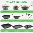 COOL- HANDLE GRIPS - Elevate your cooking comfort with cool-, form-fitting handle grips that provide a secure hold and reduce the risk of burns. Enjoy precision and control in the kitchen while effortlessly maneuvering your nonstick pans. USER-FRIENDLY DESIGN - Embrace eco-conscious cooking with our food-grade ready and user-friendly kitchenware. The pots and pans nonstick set is constructed with care, that is ready to use for gas, electric, ceramic, and induction counter cooktops. MULTI-SIZED COOKING POTS - Master the art of versatile cooking with our bakeware set's multi-sized pots, with glass lids for precise temperature control. From small to large, these pan kits cater to all culinary needs, ensuring perfectly cooked meals. MARBLE NON-STICK COATING - Experience durable and long-lasting non-stick performance with our black cookware set, ensuring effortless cooking and cleaning. The high-quality marble coating is PFOA and PFOS free for a safe culinary experience. On Dec 15, 2024 at 18:43:02 PST, seller added the following information: